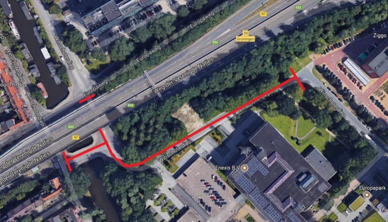 De afsluiting betreft het gebied vanaf het parkeerterrein van Ziggo tot en met de zuidelijke brug over het Oude Winschoterdiep. De hoofdingang van Enexis is door de afsluiting niet bereikbaar: medewerkers en bezoekers kunnen de achteringang gebruiken, aan de kant van het pand van Menzis.