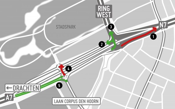 Een deel van de rotondes van Laan Corpus den Hoorn is dicht voor verkeer van zuid naar noord (4). Daarom moet verkeer vanuit Laan Corpus den Hoorn naar Hoogkerk/Drachten of naar het Stadspark via het Vrijheidsplein rijden en via een kort boogje terugrijden naar de rotondes (2). Op de rotondes moeten ze op de rechterbaan voorsorteren. Deze situatie is van 25 februari 06.00 uur tot 28 maart.