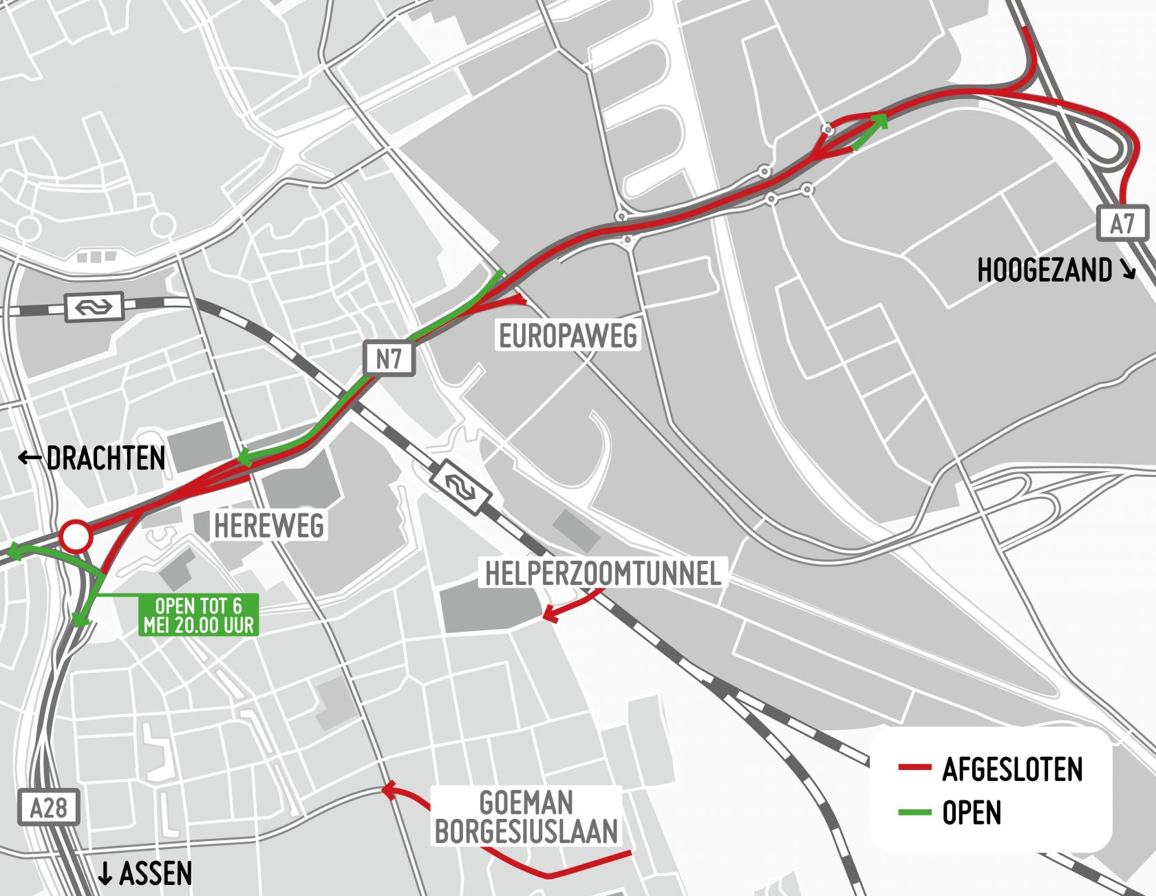 Tijdens fase 5 en fase 6 van Operatie Julianaplein, van 28 maart tot 9 mei, is de verwachting dat het drukker gaat worden in Groningen-Zuid, met name in de wijk Helpman. Om de doorstroming van het verkeer op gang te houden, worden de Helperzoomtunnel en de Goeman Borgesiuslaan in één richting afgesloten voor verkeer van oost naar west. Een alternatief voor deze richting is de verbinding op de zuidelijke ringweg van de Europaweg naar de Hereweg.