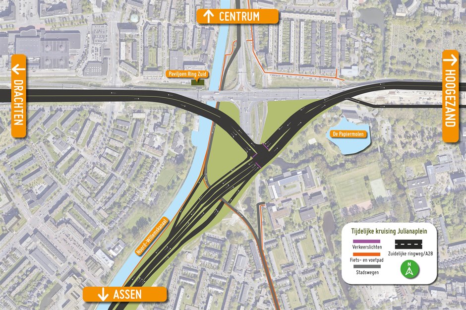 Het tijdelijke Julianaplein wordt aangesloten op drie bestaande wegen: in de richtingen Drachten (N7/A7), Hoogezand (zuidelijke ringweg, N7) en Assen (A28). Het verkeer van en naar het centrum hoeft niet over dit tijdelijke plein. Dat verkeer rijdt al vanaf eind dit jaar via de Brailleweg en over de nieuwe op- en afrit. Vandaar dat het tijdelijke Julianaplein de vorm heeft van een T-kruising. Het tijdelijke Julianaplein heeft meer capaciteit dan nu om het verkeer af te wikkelen. Daarom is de verwachting dat het verkeer op het tijdelijke Julianaplein relatief goed kan doorstromen.