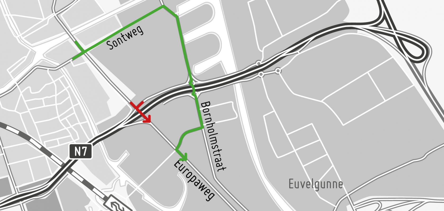 Van vrijdag 9 april 22.00 uur t/m maandag 12 april 06.00 uur is de Europaweg ter hoogte van de zuidelijke ringweg afgesloten richting het centrum van Groningen. Het verkeer wordt omgeleid via de Herningweg, de Bornholmstraat en de Lübeckweg.