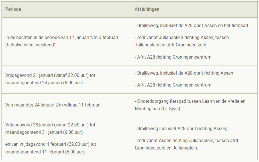 De extra afsluiting is van vrijdagavond 21 januari (vanaf 22.00 uur) tot maandagochtend 24 januari (6.00 uur). Dan is de Brailleweg afgesloten, inclusief de A28-oprit richting Assen. Ook de A28-afrit naar het centrum (voor verkeer vanuit Assen) is dan dicht.