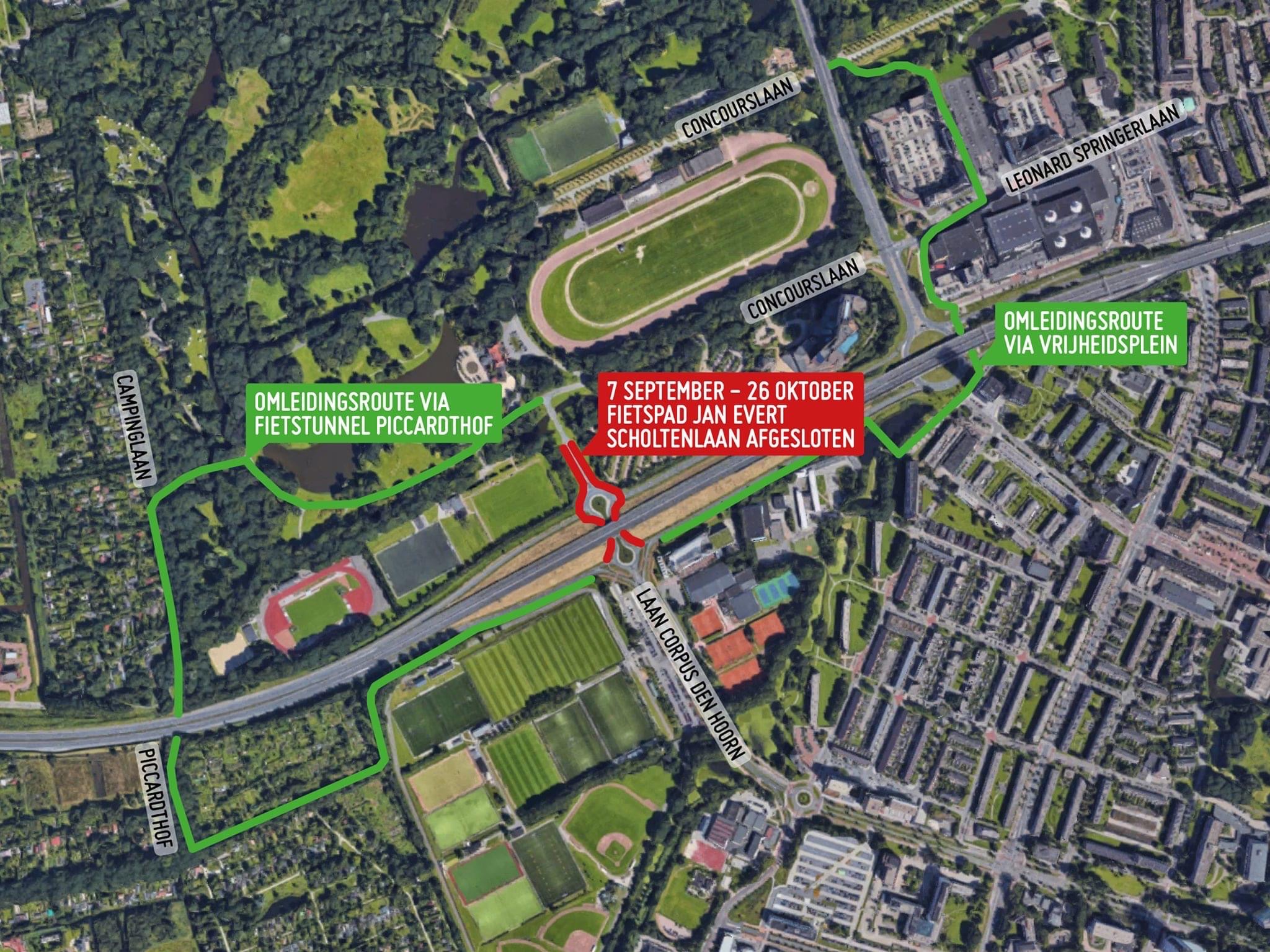 De werkzaamheden duren naar verwachting tot 26 oktober. Fietsers kunnen gebruik maken van de fietstunnel bij De Buitenhof/Piccardthof of de oversteek bij Laan van de Vrede en MartiniPlaza. Deze werkzaamheden horen bij het deelproject Verbreding wegvak Hoogkerk-Vrijheidsplein.