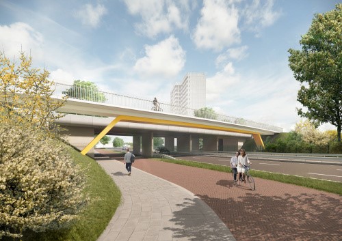 De nieuwe fietsbrug lijkt qua ontwerp op de combinatie van een ‘hoogholtje’ en ‘een plank over de sloot’. De plank wordt gemaakt van beton, het hoogholtje van staal. In het najaar van 2023 kun je over het nieuwe fietspad én de brug fietsen.
