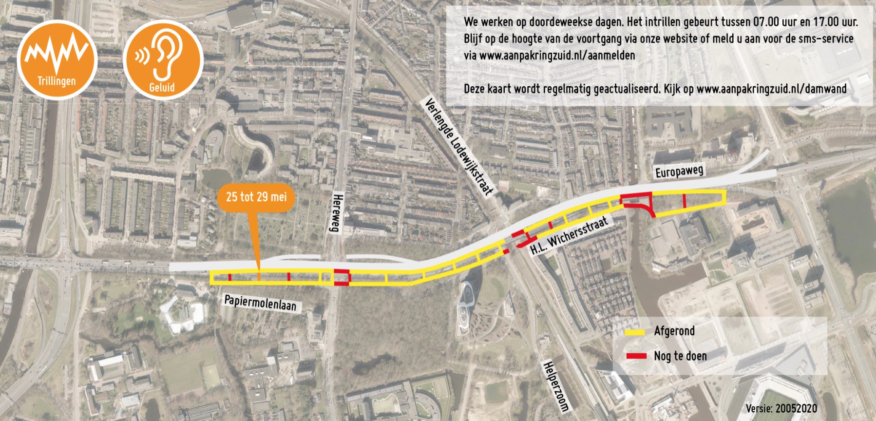 Het intrillen van damwandplanken veroorzaakt hinder zoals geluid en trillingen. In deze periode van coronamaatregelen zullen de omwonenden meer thuis zijn dan normaal. Het ontwijken van de hinder is dan ook lastig. “Wij gaan door met de werkzaamheden om vertraging te voorkomen en vragen hiervoor begrip”, aldus Herepoort.