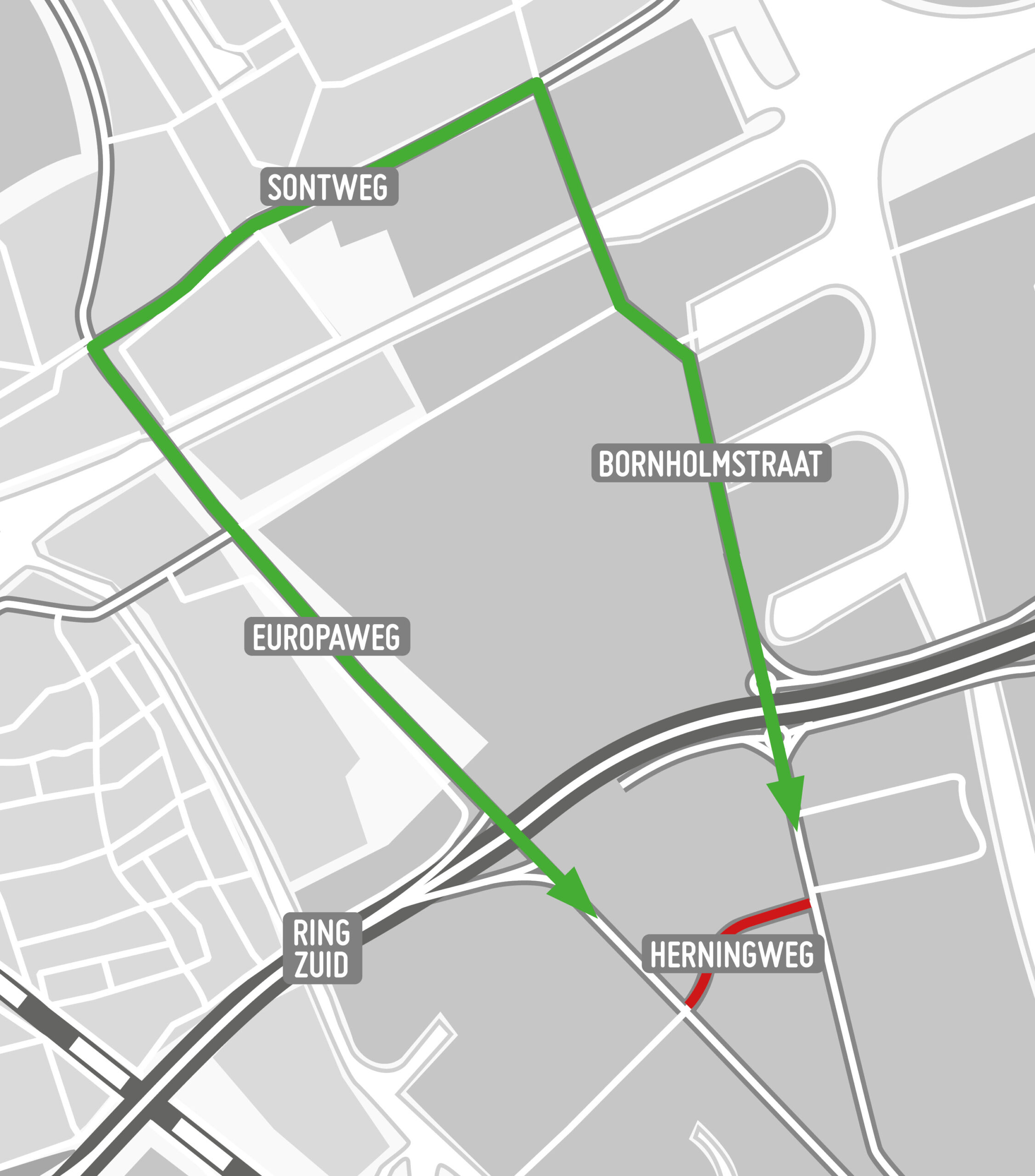 Fietsers worden een klein stukje buiten het reguliere fietspad geleid, maar kunnen langs de Herningweg blijven fietsen. Auto's worden omgeleid via de Europaweg-Sontweg-Bornholmstraat en andersom.