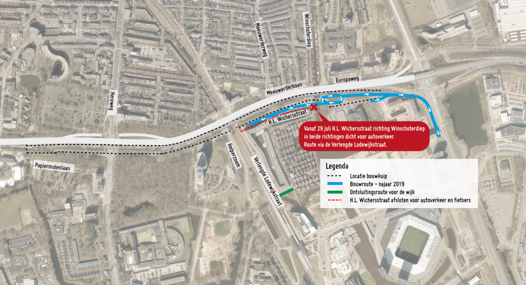De H.L. Wichersstraat en de Verlengde Meeuwerderweg (het doodlopende stuk in het verlengde van de H.L. Wichersstraat) gaan op maandag 29 juli om 10.00 uur dicht voor autoverkeer en fietsers. Voetgangers kunnen gewoon het trottoir gebruiken. De straten zijn afgesloten tijdens de bouw van de verdiepte ligging. Zodra deze is afgebouwd gaan de H.L. Wichersstraat en de Verlengde Meeuwerderweg weer open.