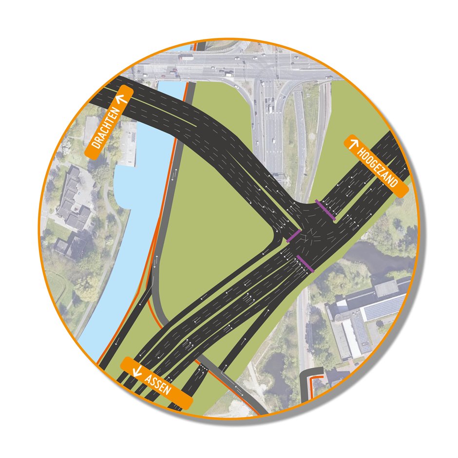 Verkeer uit de richting Hoogkerk/Drachten rijdt via een tijdelijke weg naar het tijdelijke Julianaplein. Deze weg loopt met een tijdelijke brug over het Noord-Willemskanaal heen. Op de brug heeft het verkeer uit deze richting drie rijstroken. Direct na de brug komt er een rechtsaf-strook bij, voor verkeer richting Groningen-Zuid/Assen. De overige drie rijstroken leiden het verkeer bij de T-kruising linksaf richting Helpman, oostelijke ringweg of Hoogezand.