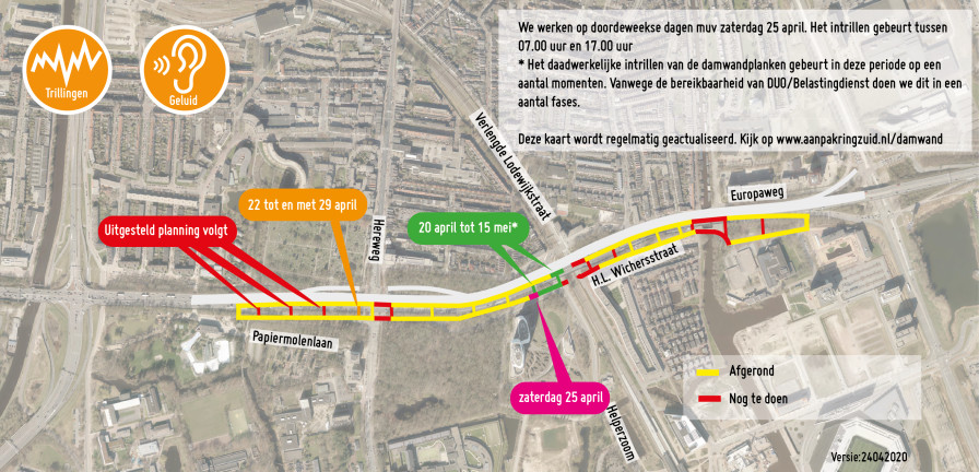 Aan de westzijde van de Hereweg trilt Herepoort een tussenwand in. Dat is een damwand die we overdwars aanbrengen, om de bouwkuip in verschillende stukken (compartimenten) te verdelen. De afgelopen week ging er materieel kapot. Daardoor konden er minder planken worden ingetrild dan gepland was. Daarom is het nodig om op deze plek wat langer door te werken. Dat gebeurt op dinsdag 28 april en woensdag 29 april. Op Koningsdag wordt niet gewerkt.