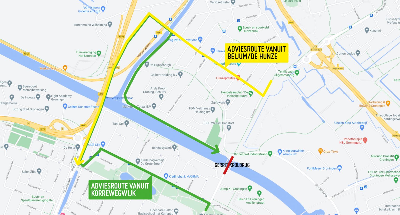 Fietsers vanuit Beijum en De Hunze worden geadviseerd via de Van Eesterenlaan, Berlageweg, Boterdiepbrug en Noordzeebrug te rijden. Voor fietsers vanuit de Korrewegwijk is de adviesroute via de Oosterhamriklaan, Noordzeebrug, Boterdiepbrug, Beijumerweg en Ulgersmaweg.