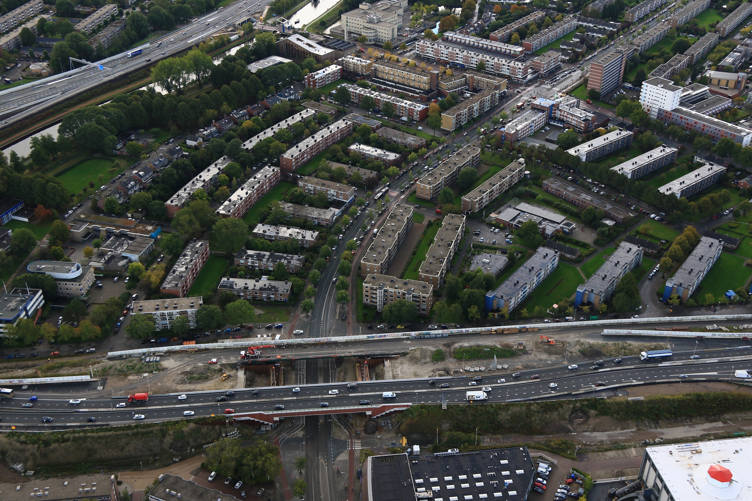 Het tijdelijke Julianaplein gezien vanuit het noorden. Het nieuwe Julianaplein krijgt straks drie verbindingsbogen boven elkaar. Tussen de gele kranen worden de contouren van de eerste nieuwe rijbaan (verbindingsboog) van het nieuwe Julianaplein zichtbaar. De verbindingsbogen zorgen er voor dat er straks geen verkeerlichten bij het Julianaplein staan en het verkeer ongehinderd door kan rijden.