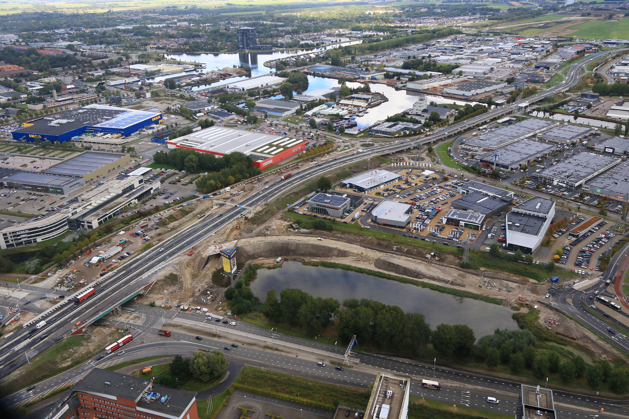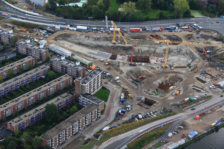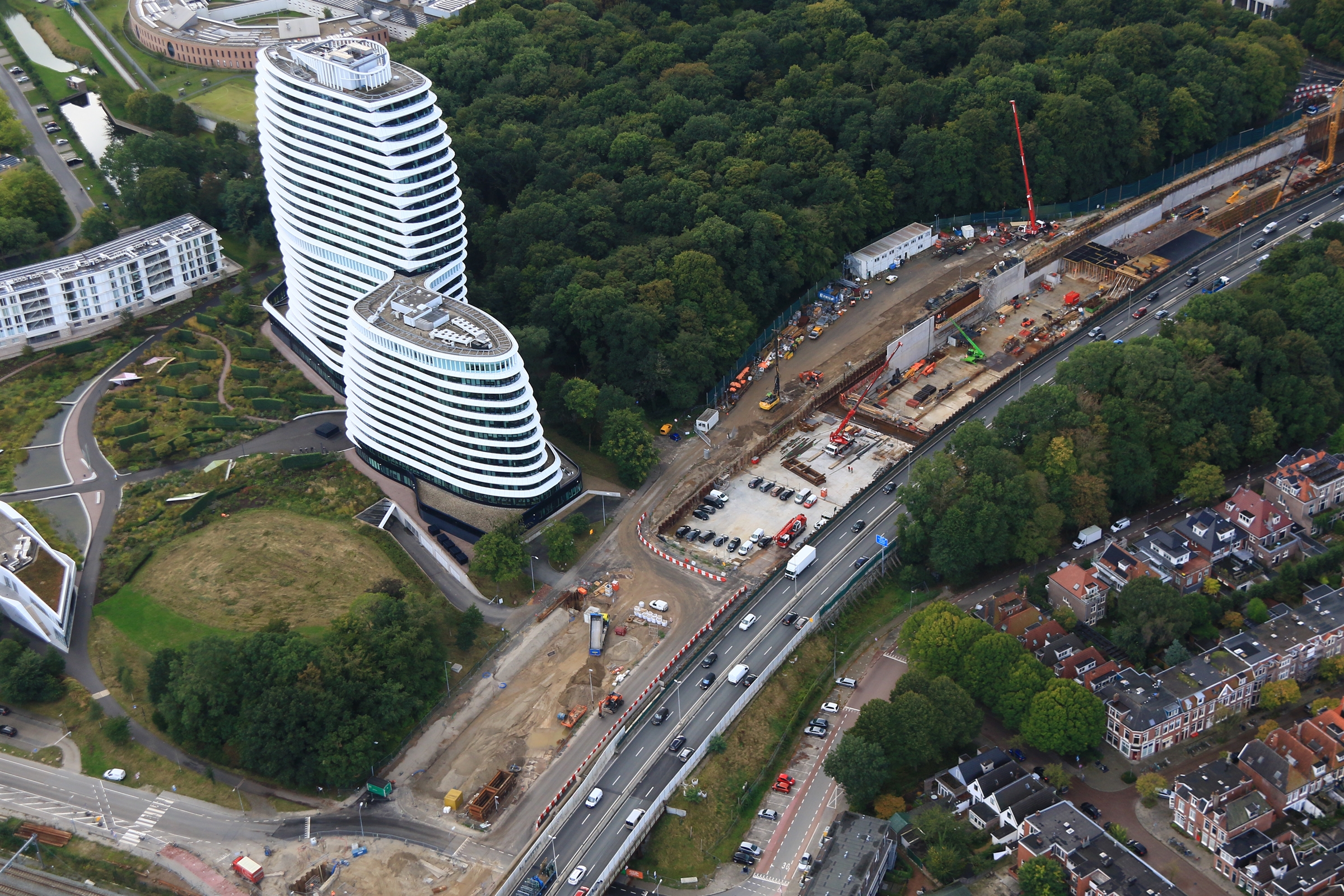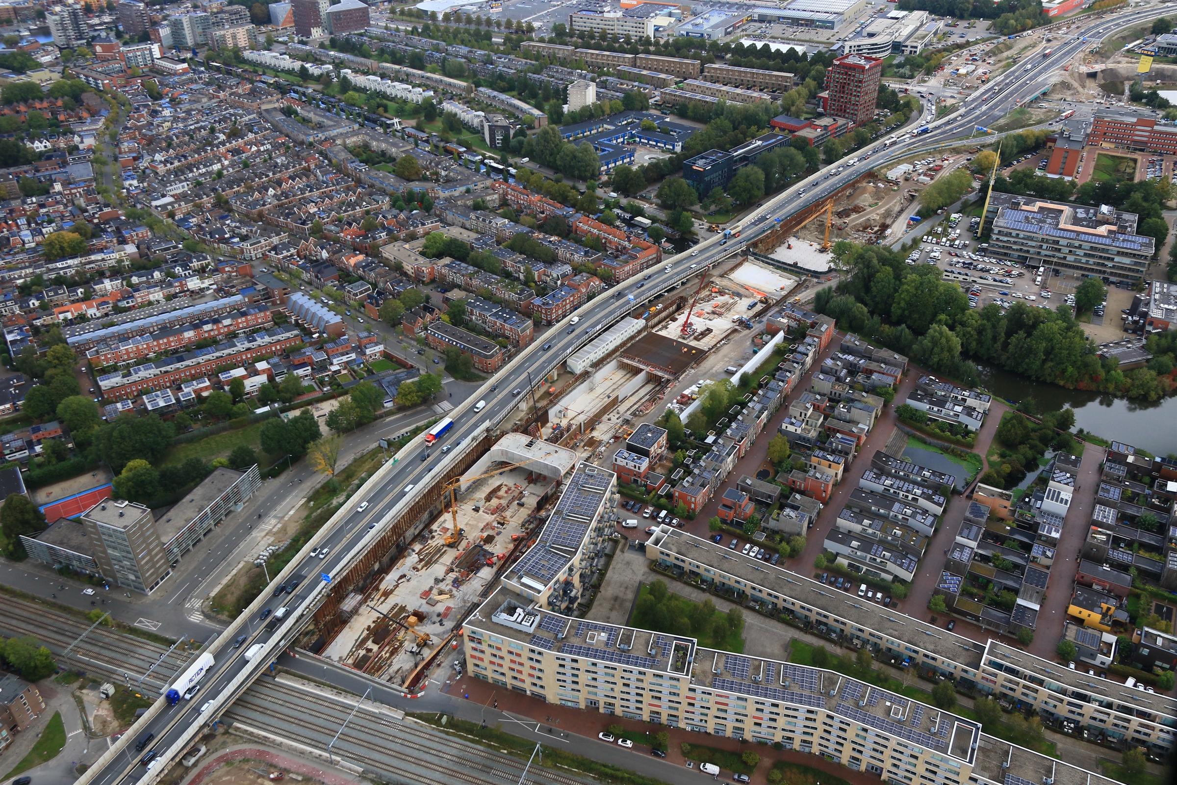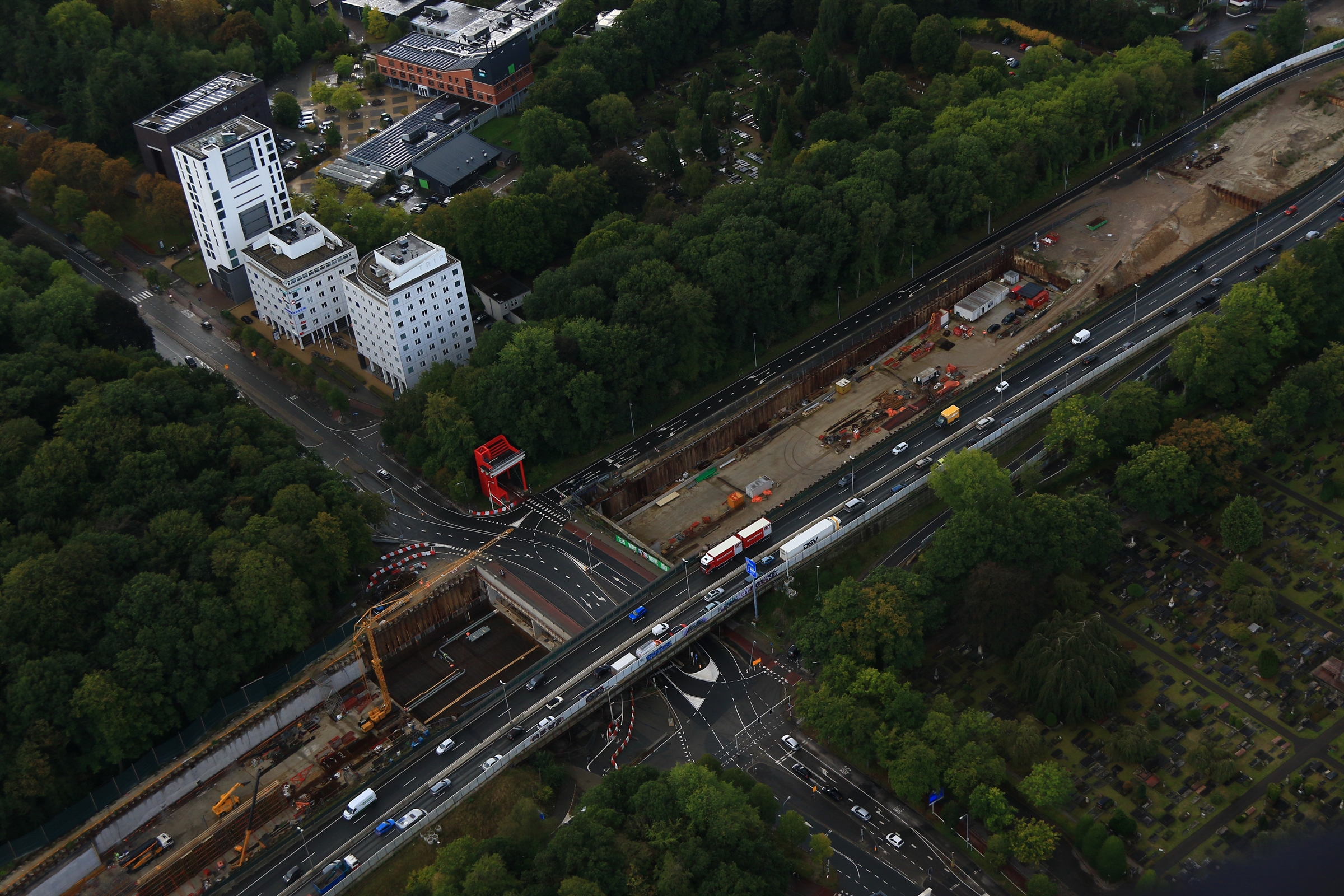 De zuidelijke ringweg wordt voor een deel verdiept aangelegd. Hier is de bouw van een deel van verdiepte ligging goed in beeld, gezien vanaf het westen. De nieuwe ringweg wordt direct aan de zuidkant van de bestaande ringweg gebouwd. Het nieuw techniekgebouw waar straks alle technische installaties van de verdiepte ligging huizen is zichtbaar.