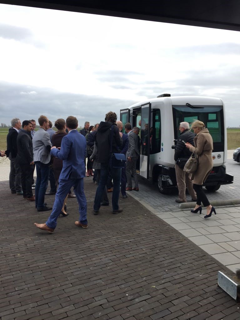 Noord-Nederland moet in de ogen van de drie noordelijke provincies een testgebied voor zelfrijdend vervoer worden. Het begin daarvan is er nu in elk geval al, want vrijdagmiddag werd in de Eemshaven, onder toeziend oog van gedeputeerde Fleur Gräper-van Koolwijk en directeur Harm Post van Groningen Seaports, (tweede en derde van links op de foto) het startsein gegeven voor een experiment met zelfrijdende busjes.