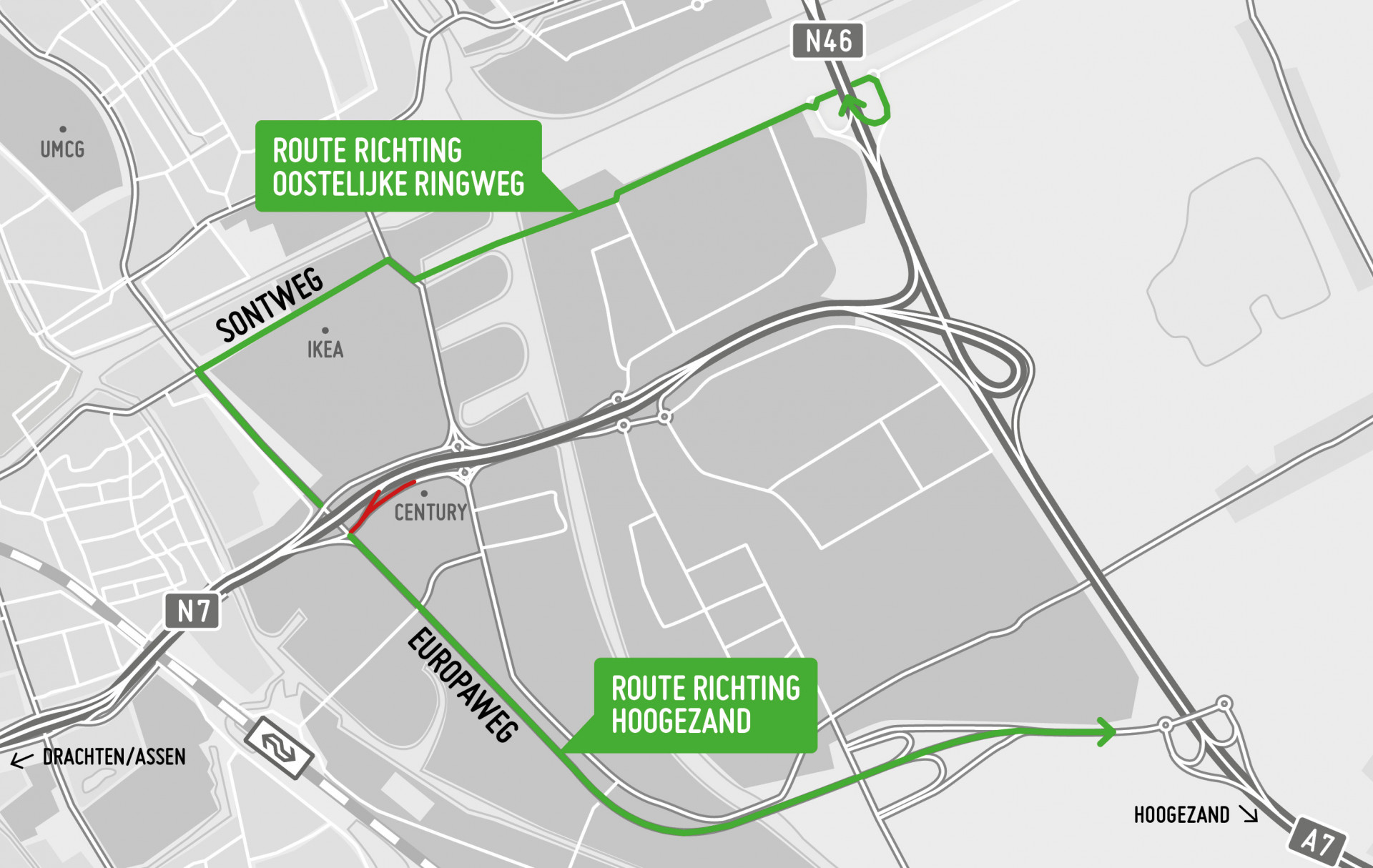 Autoverkeer dat gebruik maakte van de oprit bij de Bergenweg heeft twee goede alternatieven. Verkeer vanaf de Europaweg richting de oostelijke ringweg kan gebruikmaken van de Sontbrug. Verkeer richting Hoogezand kan de A7 bereiken via knooppunt Westerbroek.
