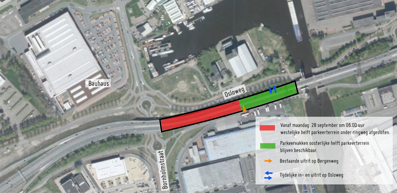 De parkeervakken aan de oostelijke kant blijven beschikbaar. Het parkeerterrein is te bereiken via een tijdelijke in- en uitrit aan de Osloweg. De huidige uitrit op de Bergenweg blijft ook beschikbaar.