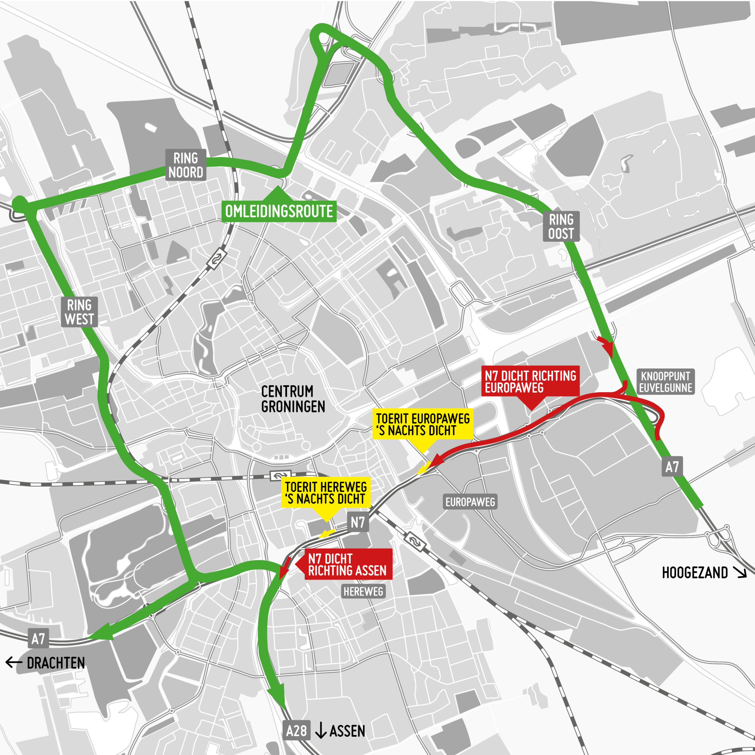 Ook de toerit Meerstad richting knooppunt Euvelgunne is afgesloten. In de nachten van zaterdag op zondag en zondag op maandag (20.00 tot 06.00 uur) zijn de toeritten vanaf de Hereweg en vanaf de Europaweg richting het Julianaplein eveneens dicht.