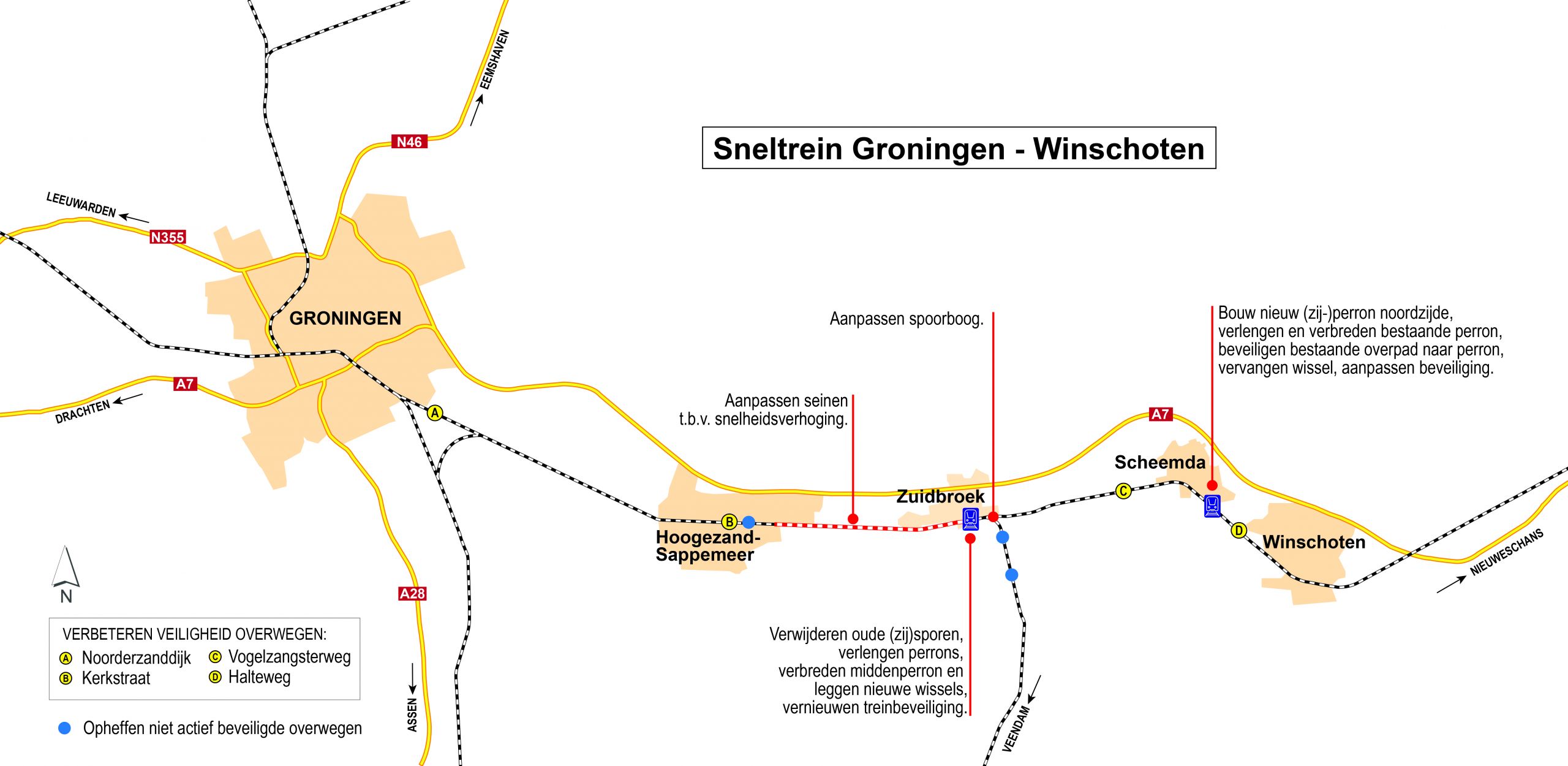 Om de extra treinen te kunnen laten rijden zijn aanpassingen nodig aan sporen en stations. Projectmanager Martin Eikelboom (ProRail): “ProRail werkt aan meer ruimte voor treinen en reizigers op de stations Zuidbroek en Scheemda. En we veranderen seinen tussen Zuidbroek en Hoogezand-Sappemeer zodat treinen dichter op elkaar kunnen rijden. Met nieuwe wissels en aanpassingen aan spoorbeveiliging op diverse plekken kunnen treinen straks sneller rijden. Het werk vindt in een relatief korte periode van enkele maanden plaats en levert een groot resultaat op.”