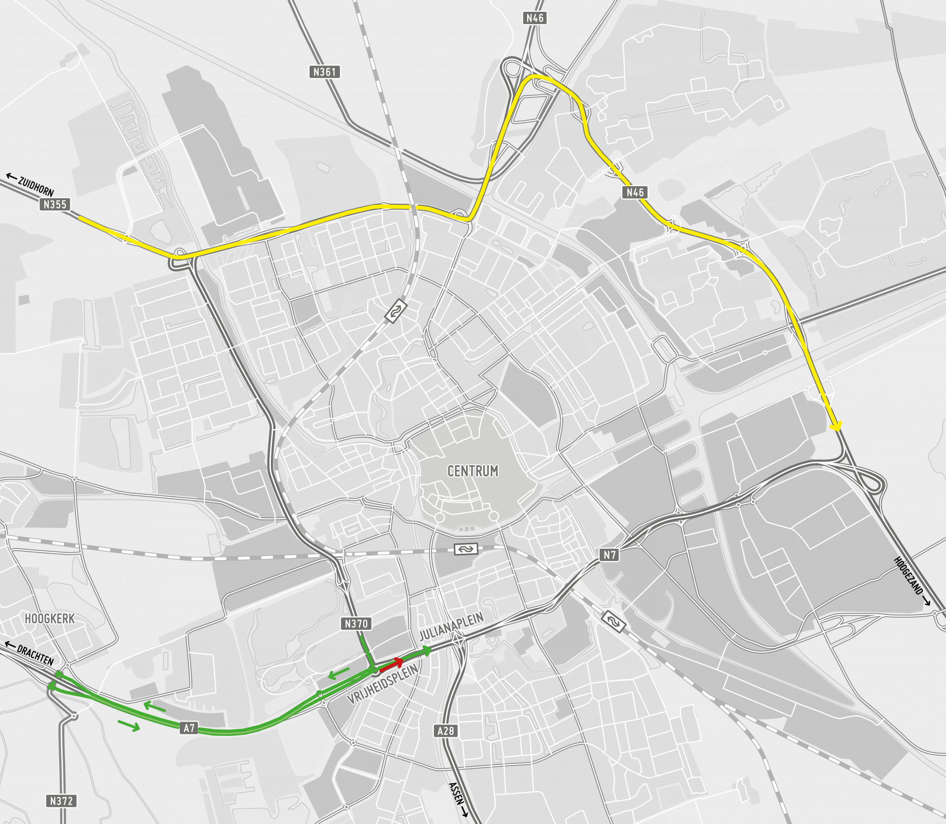 Ook verkeer vanaf Laan Corpus den Hoorn kan tijdens de werkzaamheden niet via het Vrijheidsplein naar het Julianaplein rijden. Automobilisten richting Hoogezand kunnen omrijden via de ringwegen. Verkeer op de Laan Corpus den Hoorn richting Assen kan beter doorrijden naar de aansluiting Groningen-Zuid op de A28.