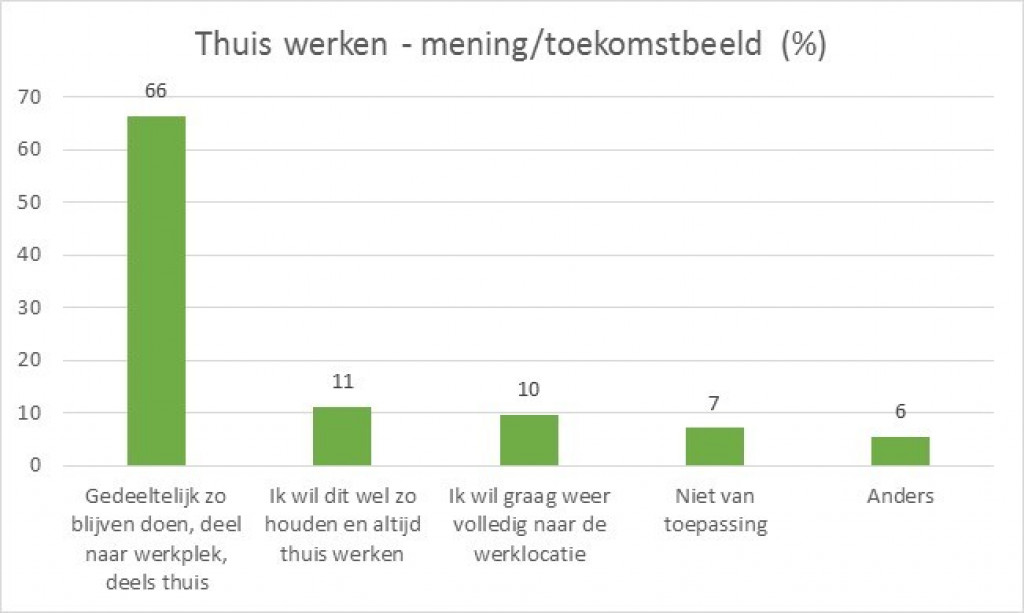 Over het algemeen is men positief over thuiswerken, maar dan het liefst afgewisseld met werken op de werklocatie. Zo’n 66% wil graag gedeeltelijk thuis blijven werken, 11% zou altijd wel thuis willen werken en 10% werkt liever helemaal weer op kantoor. Respondenten konden ook een eigen antwoord geven bij de vraag wat hun mening is over thuiswerken. Sommigen geven aan dat ze thuiswerken 'verschrikkelijk' of 'waardeloos' vinden. Iemand hoopt juist op 'acceptatie van rare werktijden'. Een antwoord wat vaker terugkomt is de optie om 80% van de tijd thuis te werken en 20% op kantoor.