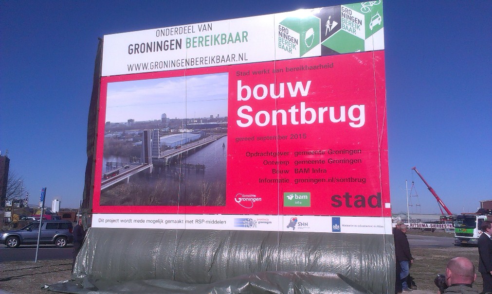 Van Keulen voer woensdagmiddag, in het gezelschap van regiodirecteur Jan van der Meer van bouwbedrijf BAM Noord en de verzamelde pers, op een ponton van het Eemskanaal naar de plek aan de oever van de Deense Haven, vanwaar de Sontbrug het Winschoterdiep zal overspannen. Eenmaal ontdaan van de reddingsvesten en weer met vaste grond onder de voeten, onthulden de wethouder en de BAM-directeur het grote bouwbord op de hoek van de Sontweg en de Bornholmstraat. Volgens Van Keulen ook voor hemzelf een speciaal moment: ‘De Sontbrug was toch één van de eerste projecten die ik als wethouder door de raad heb mogen loodsen.’