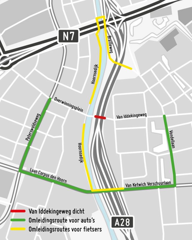 Autoverkeer wordt omgeleid via de Paterswoldseweg, Laan Corpus den Hoorn, Van Ketwich Verschuurlaan en de Vondellaan.