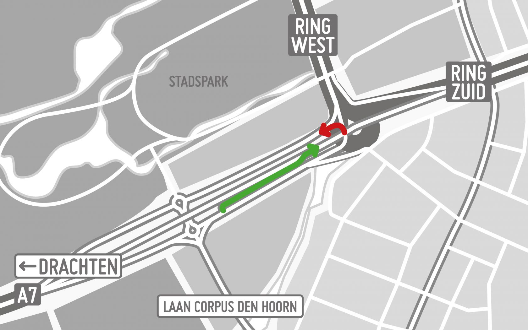 Verkeer op de westelijke ringweg rijdt vanaf 28 maart via de dubbele rotonde bij Laan Corpus den Hoorn naar de nieuwe toerit toe. Belangrijk is dat het verkeer dat richting de zuidelijke ringweg of de A28 wil, de linker rijbaan richting de rotonde gebruikt. De rechter rijbaan is bedoeld voor het verkeer richting Drachten/Hoogkerk en richting Martini Ziekenhuis.