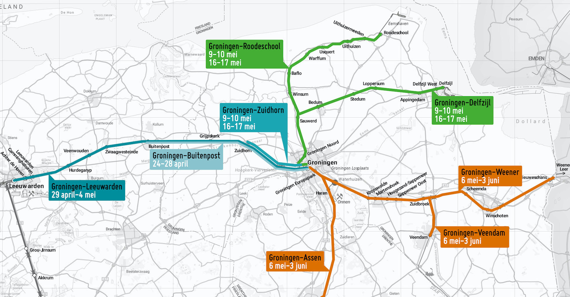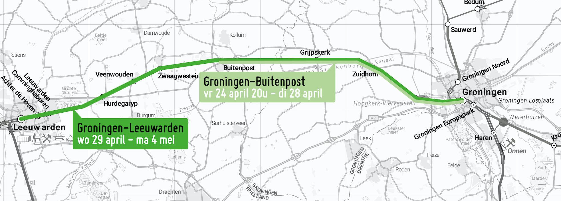 Van vrijdagavond 24 april 20.00 uur tot en met dinsdag 28 april rijden er geen treinen tussen Groningen en Buitenpost en van woensdag 29 april t/m maandag 4 mei rijden er geen treinen tussen Groningen en Leeuwarden. Arriva zet bussen in.