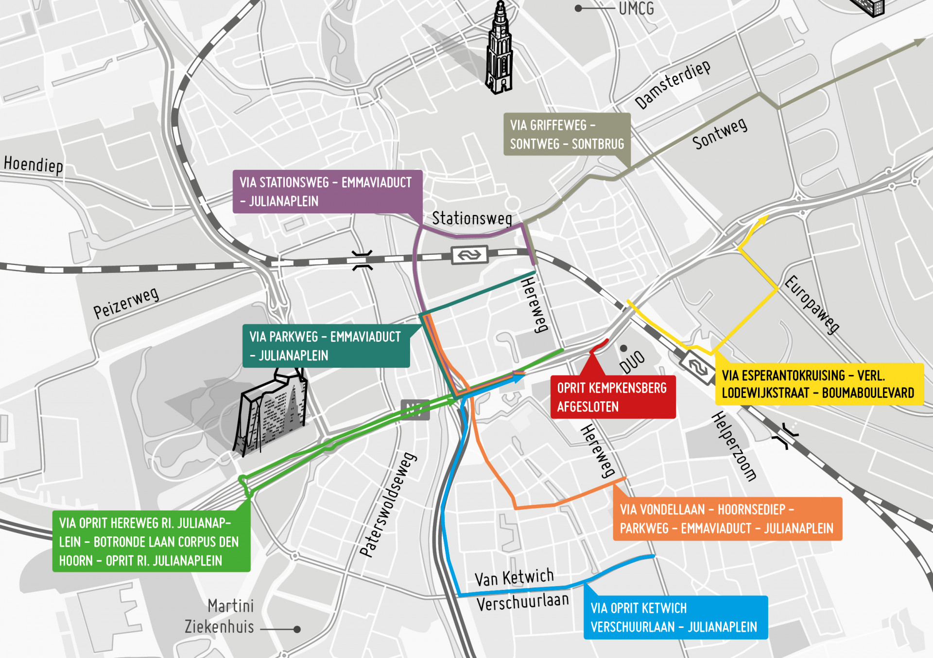 De oprit Kempkensberg ging gisteravond rond 22.00 uur definitief dicht. Het verkeer vanaf de Hereweg kan nu niet meer via de Kempkensberg de zuidelijke ringweg oprijden richting Hoogezand en Delfzijl.