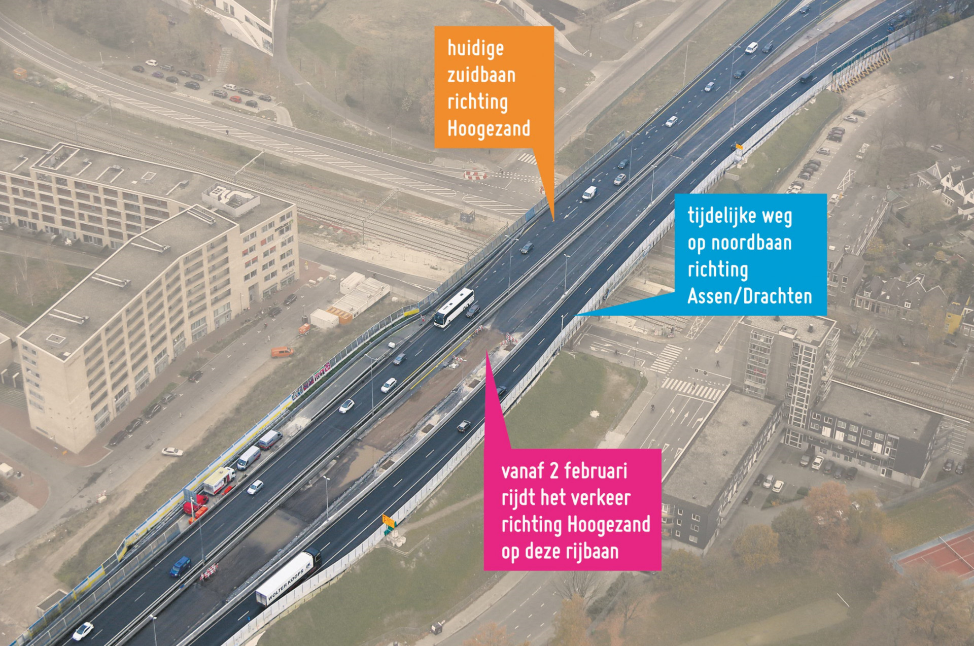 De tijdelijke zuidbaan op de ringweg ligt op de plek van de voormalige noordbaan. Hij begint ter hoogte van de Hereweg en loopt door tot vlak voor de afrit naar de Europaweg. De rijbaan bestaat uit twee versmalde rijstroken. De maximumsnelheid is 70 km per uur. Deze situatie blijft de komende jaren bestaan. Vanaf het Julianaplein is de afrit Hereweg nog bereikbaar. Ook kan het verkeer vanaf de Hereweg nog de oprit Julianaplein nemen. Via de webcam kun je de nieuwe situatie zien.