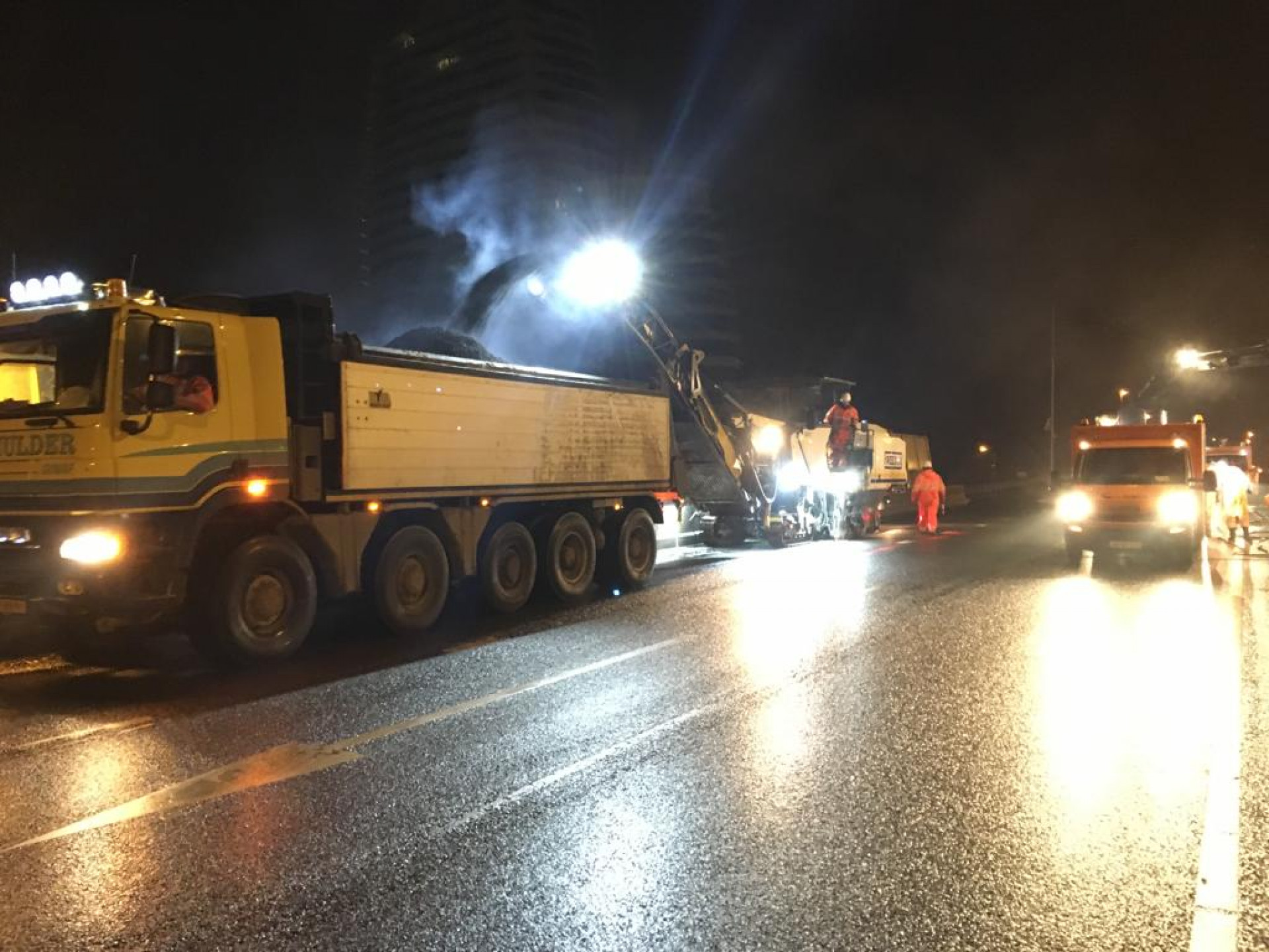 De werkzaamheden vannacht verliepen volgens planning. Combinatie Herepoort heeft onder andere asfalt aangebracht en de markering aangepast. Verder hebben we tijdelijke bebording geplaatst, hectometerbordjes omgezet en reflectoren op de middenbarrière aangebracht. Tot slot hebben we zout over de tijdelijke zuidbaan gestrooid omdat het nog licht vroor.