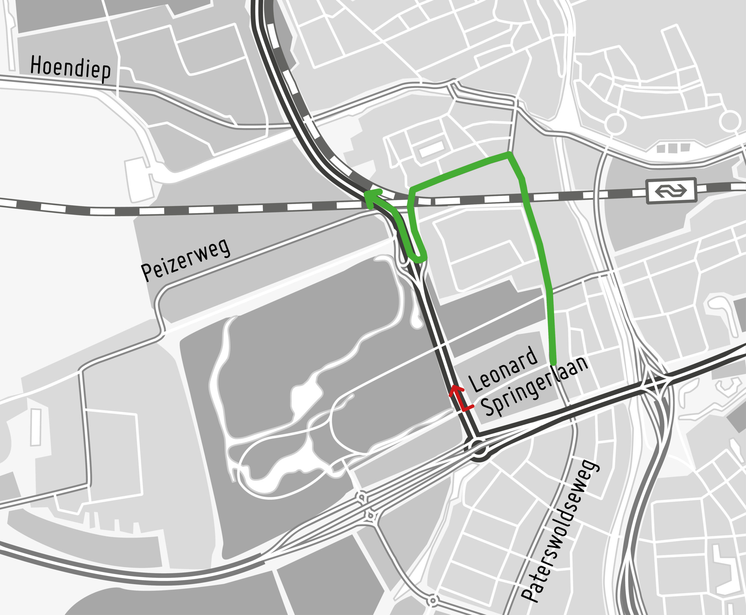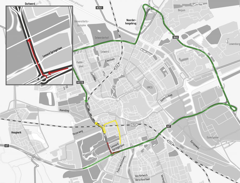 Vanaf maandag 20 september is het voor verkeer vanuit Drachten niet meer mogelijk op de westelijke ringweg rechts af te slaan naar de Leonard Springerlaan. Dit verkeer moet doorrijden naar de volgende afrit. Alleen verkeer op de tijdelijke weg vanaf het Julianaplein kan rechtsaf de Leonard Springerlaan inrijden. Deze situatie geldt ook voor twee jaar.