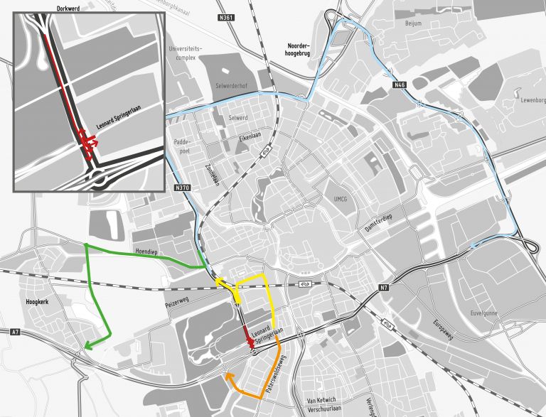 In het weekend van vrijdag 3 september 22.00 uur tot maandag 6 september 06.00 uur is een groot deel van de kruising volledig afgesloten. Alleen verkeer vanaf het Vrijheidsplein kan de westelijke ringweg en de Leonard Springerlaan bereiken. Het overige verkeer heeft een aantal opties als omleidingsroutes, zie onderstaand kaartje.