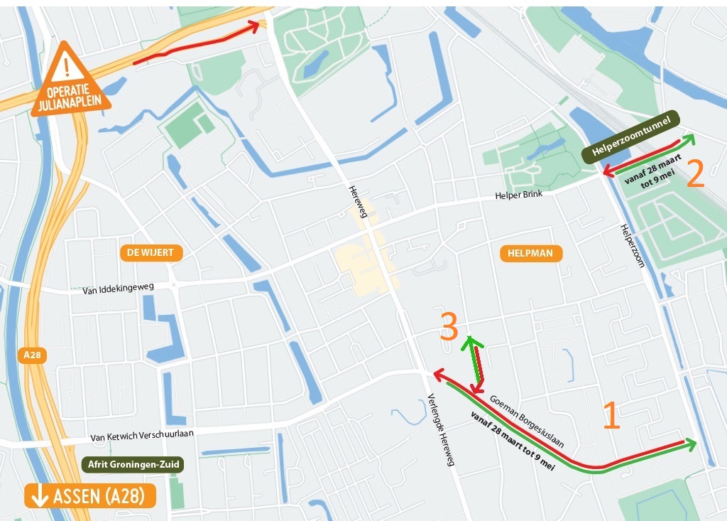 De afsluiting heeft te maken met Operatie Julianaplein, legt Aanpak Ring Zuid uit. Om de doorstroming van het verkeer te verbeteren, worden er ook in de wijk Helpman tijdelijke maatregelen genomen. Deze maatregelen moeten ook voorkomen dat het autoverkeer zijn weg gaat zoeken door de smalle straten in de wijk die hiervoor niet geschikt zijn. Denk aan de Helper Brink, waaraan ook enkele scholen gevestigd zijn.