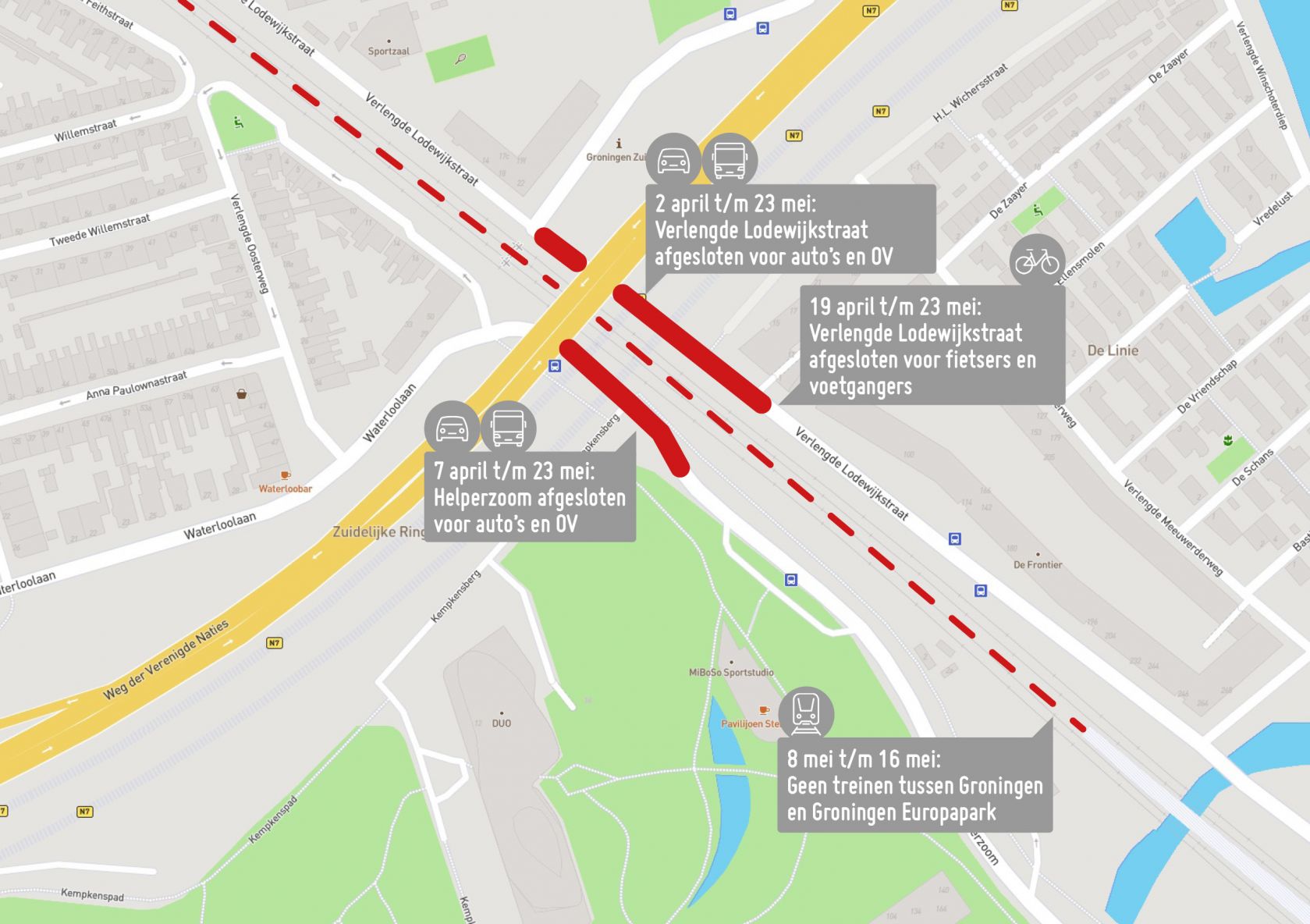 De Helperzoom moet ook worden afgesloten. Van woensdag 7 april t/m zondag 23 mei is de Helperzoom in beide richtingen afgesloten voor autoverkeer ter hoogte van de zuidelijke ringweg.