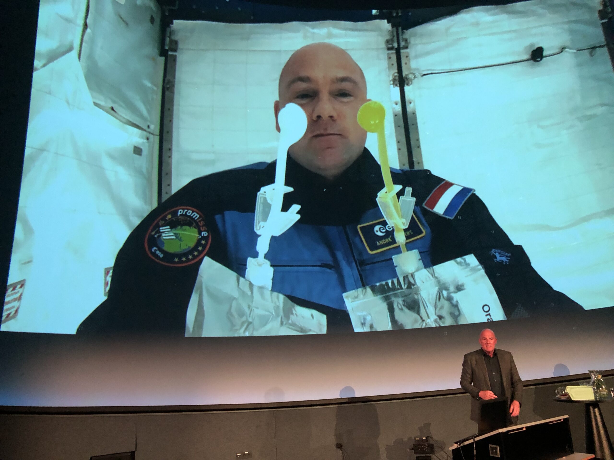 De CCG had Kuipers gestrikt voor een lezing van een uurtje. Kuipers en de 200 aanwezigen kregen eerst nog een voorproefje met een fulldome reisje door de ruimte. Dat inspireerde de astronaut zelf ook, want uiteindelijk sprak hij twee uur lang over zijn ervaringen in de ruimte. Van de vele uren aan trainingen in verschillende landen tot ‘hoe ga je eigenlijk naar het toilet’. Kuipers: “Dan kijk je naar een paneel vol knopjes. De teksten zijn in het Russisch. Technisch Russisch en in afkortingen. Zelfs m’n tolk snapte er niets van.”