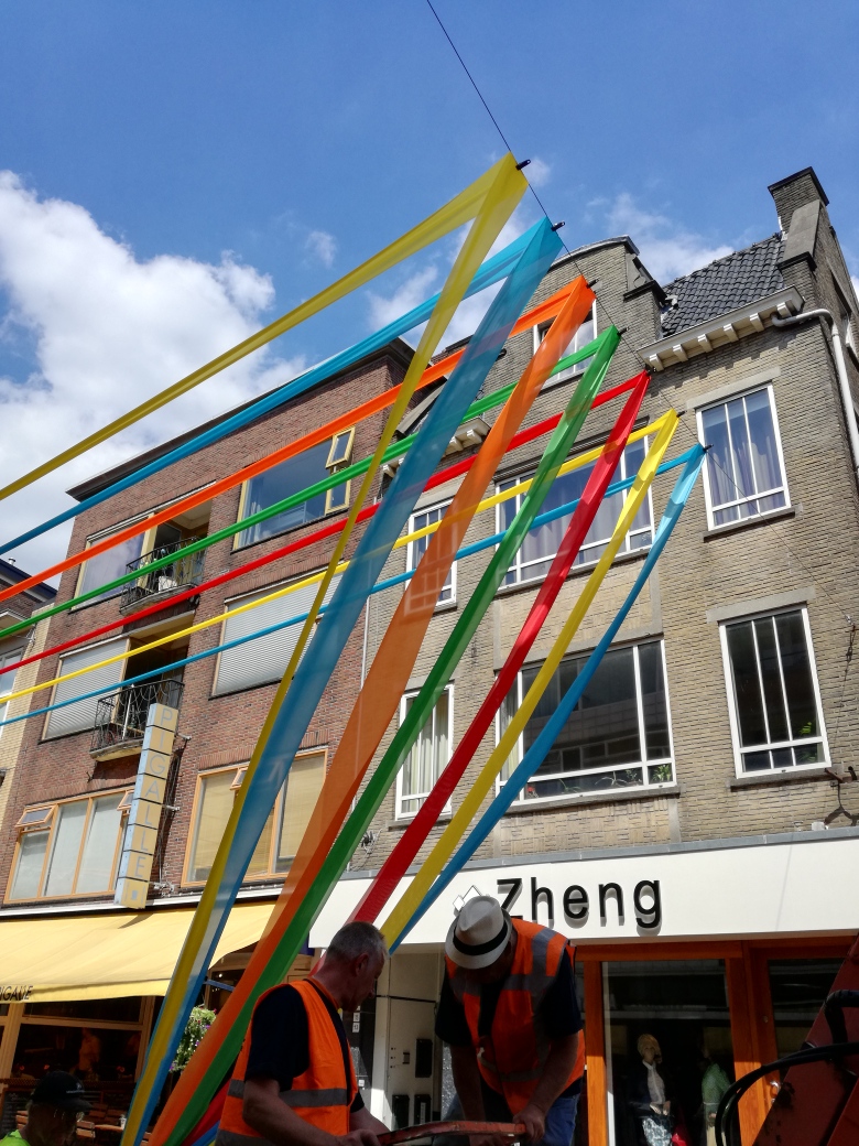 De kleurrijke linten komen in de lengte van de straat en zijn van licht doorlatend vlaggenmateriaal. Ze worden van spandraad tot spandraad opgehangen met een golvend effect. Dit zorgt voor een levendig en vrolijk straatbeeld.