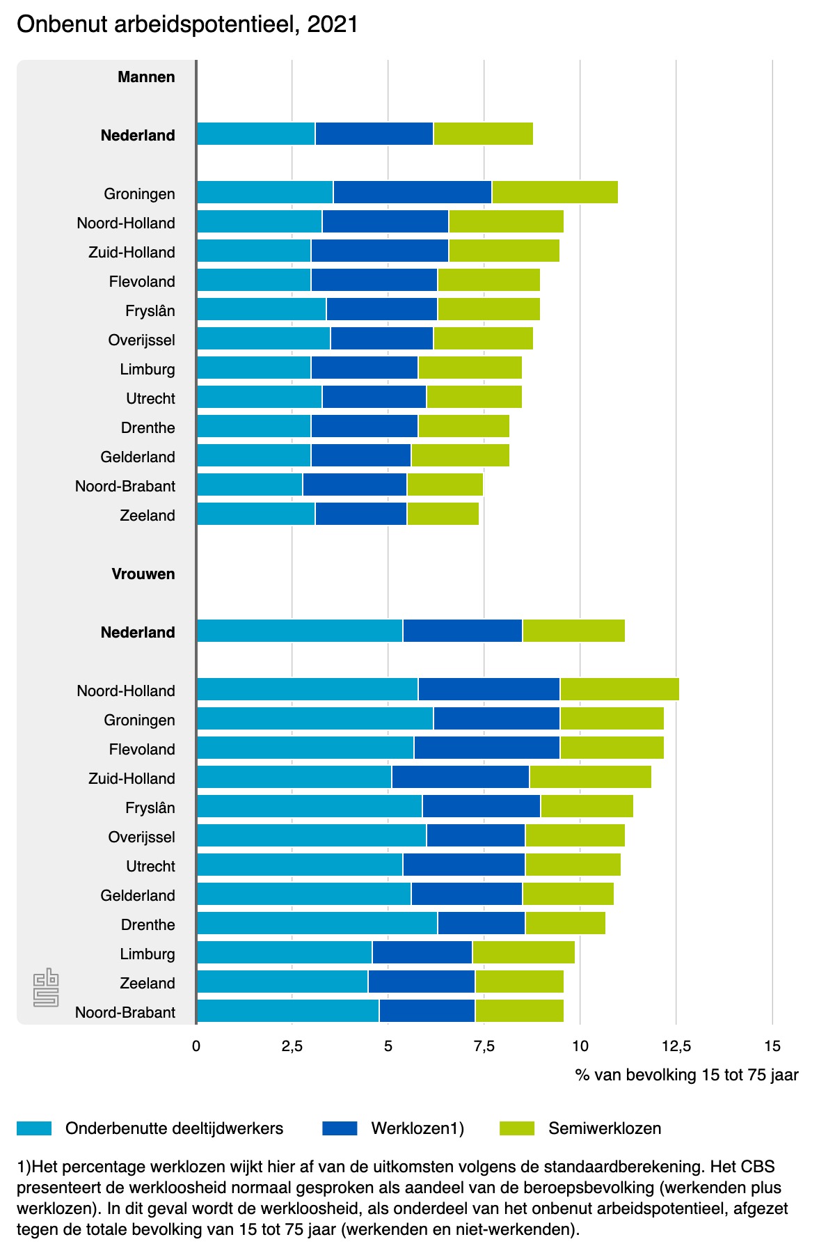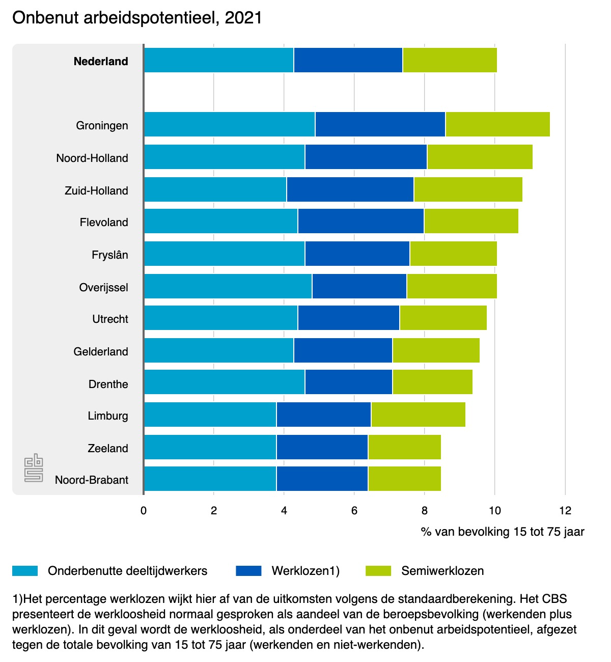 Het onbenut arbeidspotentieel bestaat uit werklozen, semiwerklozen en onderbenutte deeltijdwerkers tussen de 15 en 75 jaar. Groningen wordt gevolgd door Delft (13,9 procent), Wageningen (13,7 procent) en Amsterdam (13,5 procent). Ook qua provincie staan we bovenaan, met een percentage van 11,6, gevolgd door Noord-Holland met 11,1 procent. Het onbenut arbeidspotentieel is het kleinst in de drie zuidelijke provincies: Noord-Brabant, Zeeland en Limburg.