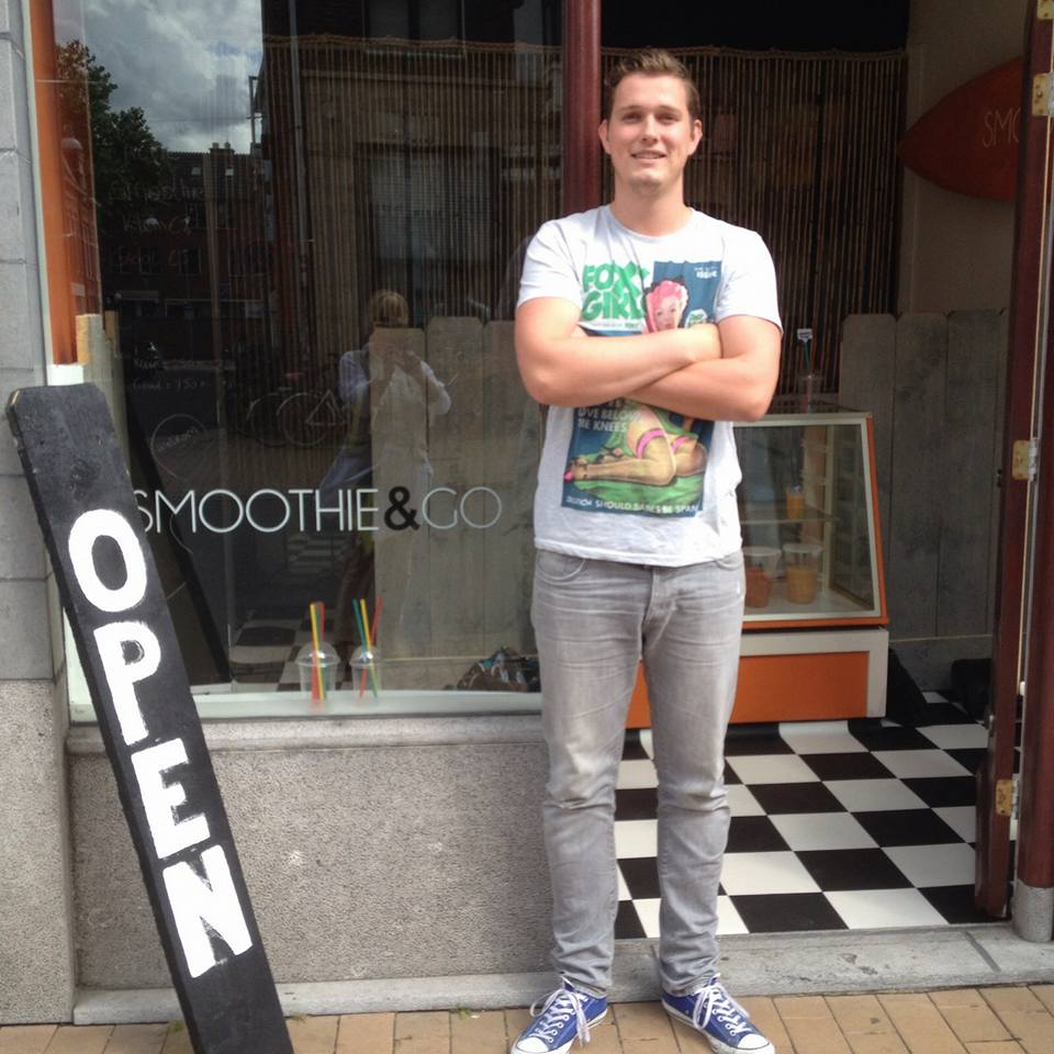 In april dit jaar ben ik met mijn cateringbedrijf ‘My Smoothie’ begonnen. Na enig succes wilde ik een eigen plek om de smoothies te kunnen maken. Ik ben op zoek gegaan naar een bedrijfsruimte in de binnenstad. Via een goede kennis kwam ik terecht op de plek waar mijn winkel nu zit. Ik zocht eigenlijk een ruimte om de smoothies te kunnen bereiden en niet om ze daar ook ter plekke te verkopen. Een eigen winkel zag ik eerst niet zitten. Uiteindelijk besloot ik om het wel te doen, je bent tenslotte een ondernemer. Ik ben een week lang elke dag van 7 uur ’s ochtends tot 1 uur ‘s nachts bezig gegaan met het opzetten van de winkel. Na de opening van ‘Smoothie & Go’ verliep het in het begin nog heel stroef. Ik moest het hele proces eerst nog onder de knie zien te krijgen, maar na veel frustratie en hard werken heb ik het toch voor elkaar gekregen. Gelukkig heb ik veel vrienden en familie die bereid zijn me te helpen en tips te geven. Een vriend helpt mij bijvoorbeeld ook tijdelijk even in de winkel. Toch krijgt de catering nog steeds mijn hoofdaandacht. Daar heb ik nog vele plannen voor in de toekomst.