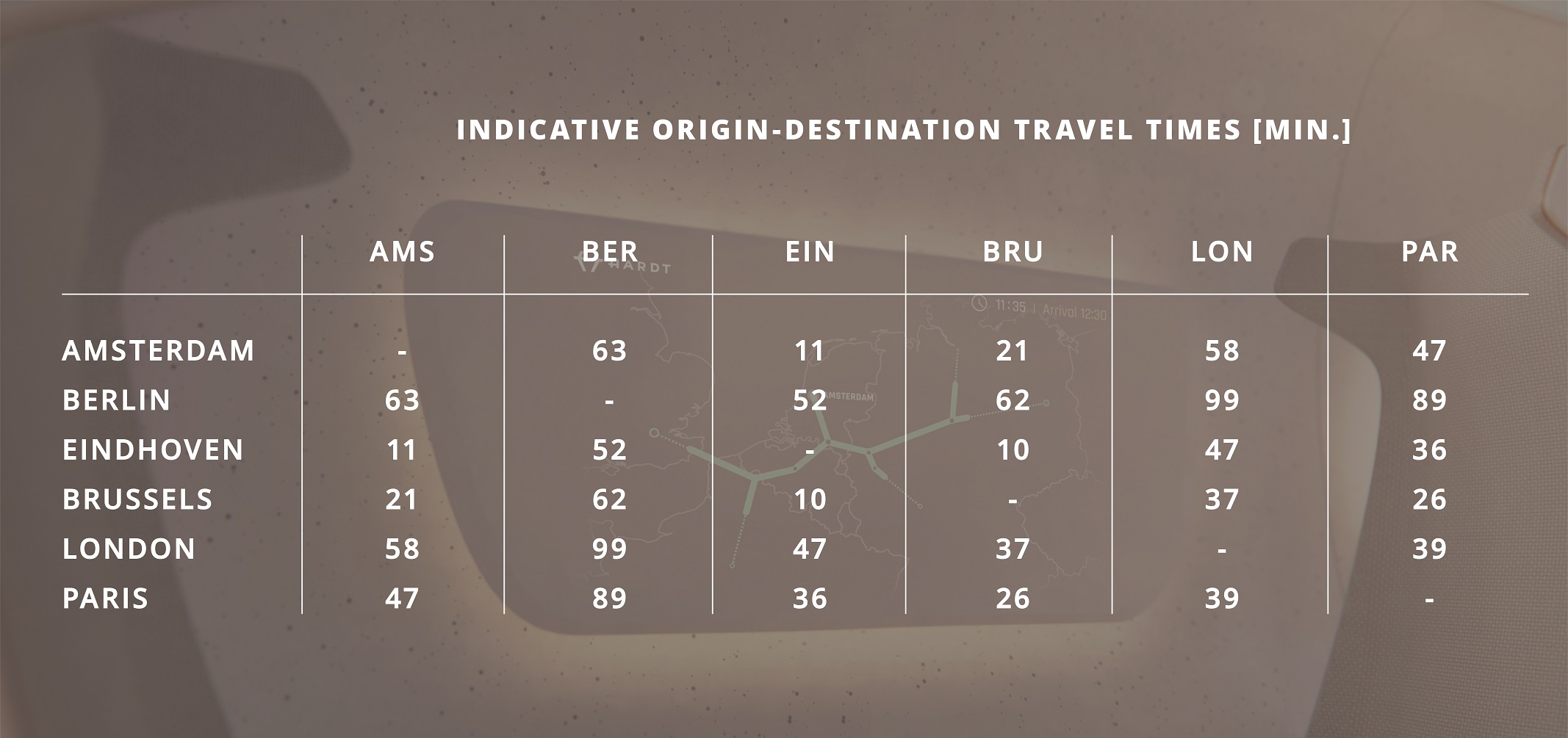 Dit digitale onderdeel van de experience neemt je mee op een fictieve, maar mogelijke eerste hyperlooproute van Amsterdam, via Eindhoven en Düsseldorf, naar Berlijn. Een reis die met een hyperloop iets meer dan een uur zou duren. De eerste echte hyperlooproute zou vanaf 2028 een feit kunnen zijn. De implementatie van een pan-Europees hyperloopnetwerk zou woon-werkgebieden sterk vergroten, en biedt mensen daarmee de mogelijkheid te wonen hoe of waar men wil, zelfs over landsgrenzen, zonder de maximaal wenselijke reistijd voor woon-werkverkeer van 60 minuten te overschrijden.