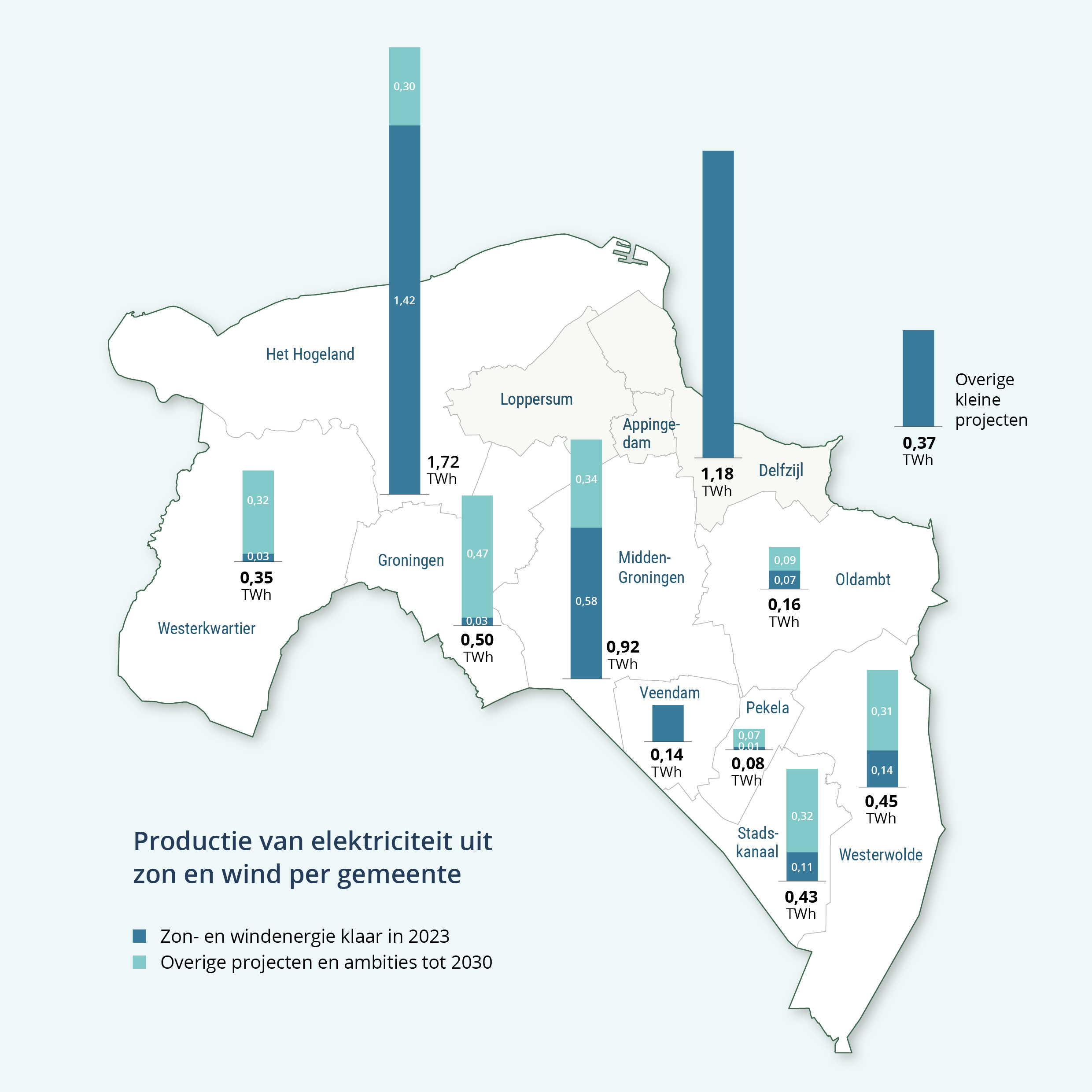 De getallen op de kaart zijn ramingen van projecten en ambities per gemeente. Die tellen op tot 6,3 TWh. Voor de concept RES is er rekening mee gehouden dat mogelijk niet alle gemeentelijke ambities kunnen worden gerealiseerd. Daarom is het ‘bod’ van de RES-regio Groningen gesteld op 5,7 TWh.