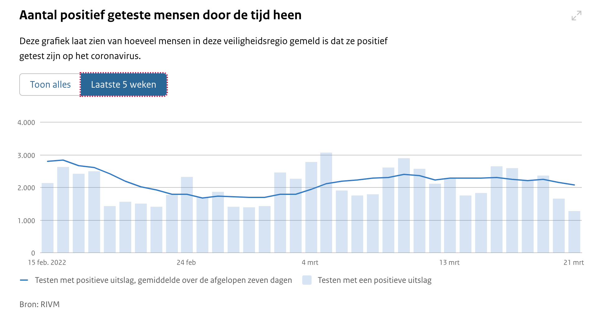 De piek van de afgelopen weken lag halverwege februari, toen er gemiddeld bijna 4000 besmettingen per dag werden gemeld. Ook op 5 maart was er een kleine piek te zien. Op die dag werden er ruim 3000 positieve testen gemeld.