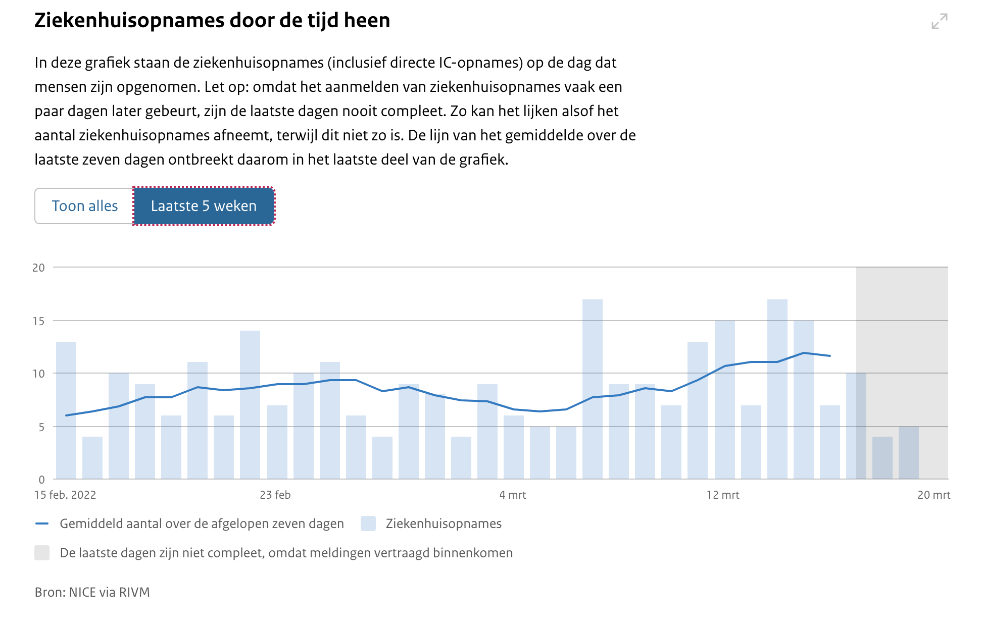 Er is nog geen duidelijke daling te zien in het aantal ziekenhuisopnames van personen met een coronabesmetting. Tussen 7 en 16 maart steeg het gemiddelde aantal opnames juist, van dagelijks bijna 8 naar bijna 12.