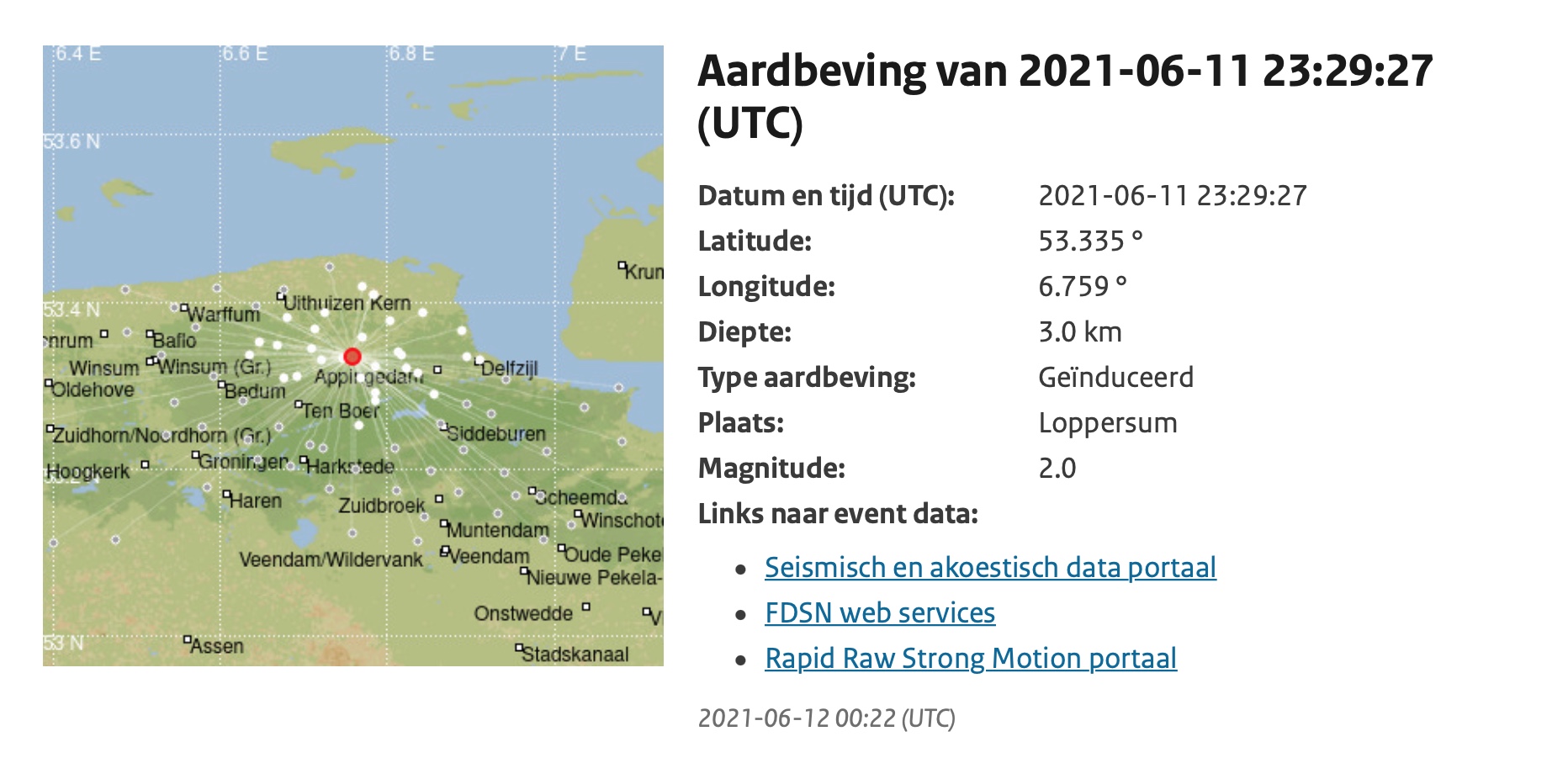 De beving vond iets na half twee ’s nachts plaats. Het KNMI registreerde aanvankelijk een beving met een magnitude van 2.1, waarbij het epicentrum bij Eenum lag. Dat werd later bijgesteld naar een beving van 2.0 en het epicentrum bij Loppersum.
