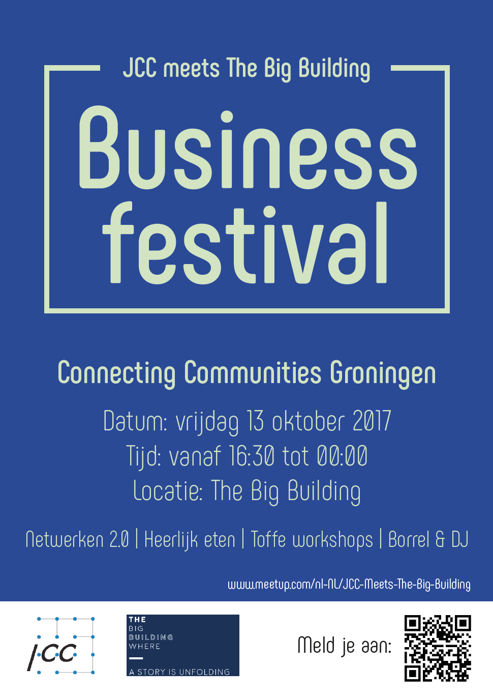 De eerste editie van JCC Meets TBB Business Festival staat in het teken van ontmoetingen, samenwerken en netwerken 2.0. Dat gebeurt door middel van een vrijdagmiddagborrel, workshops DJ en wijnproeven, een DJ, een Big Playground met onder andere pingpong en VR-ervaringen en een goede hap eten.