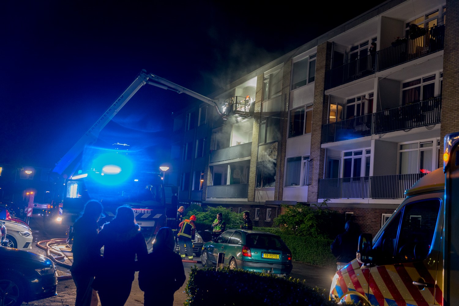 De brand was na aankomst van de brandweer snel onder controle. Zekerheidshalve werden de appartementen boven de verdieping waar de brand was ontruimd. (Foto's: Rieks Oijnhausen Fotografie)