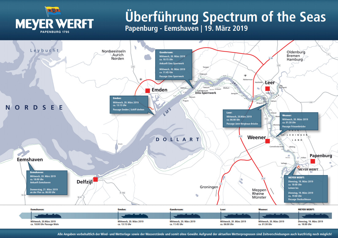 De Spectrum of the Seas wordt dinsdagavond rond 19.0 uitgedokt. Het schip vaart dan ’s nachts op de Eems via Weener en Leer naar Emden. Daar komt het woensdag om 13.15 uur aan. Zodra het tij dat toelaat, kan het schip koers zetten naar de Eemshaven. Naar verwachting arriveert het schip daar donderdag om 18.00 uur. Je kunt het schip hier volgen.