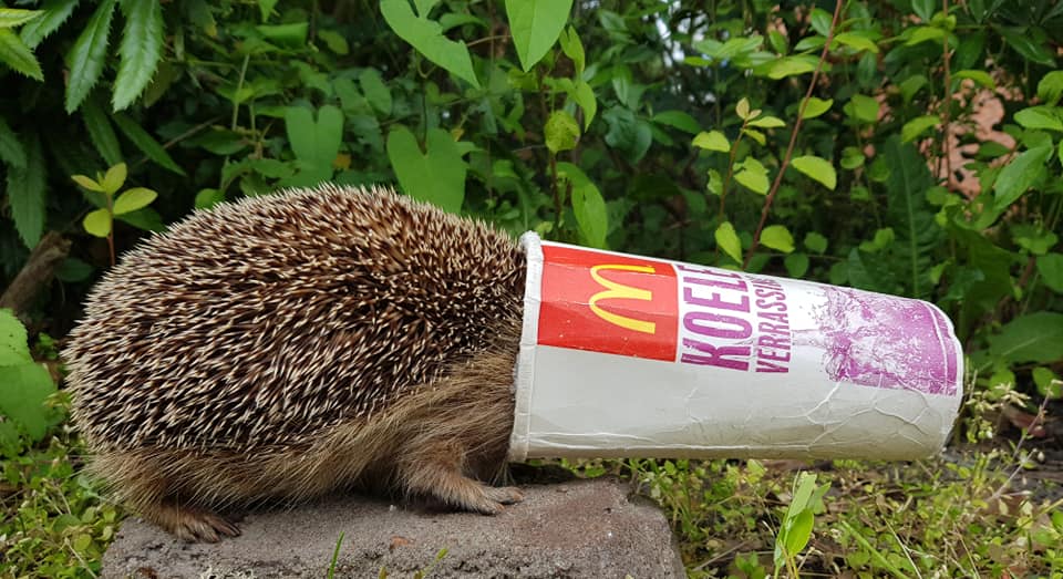 De foto’s zouden zijn genomen bij de nieuwe wijk Ter Borch. Daar is een vestiging van McDonalds. Hoewel het bedrijf er hard aan werkt om zwerfvuil tegen te gaan, slagen sommige klanten er toch in de troep gewoon uit het raam te gooien. Dat zou er toe kunnen leiden dat egels, zoekend naar etensresten, er met het hoofd in vast komen te zitten.