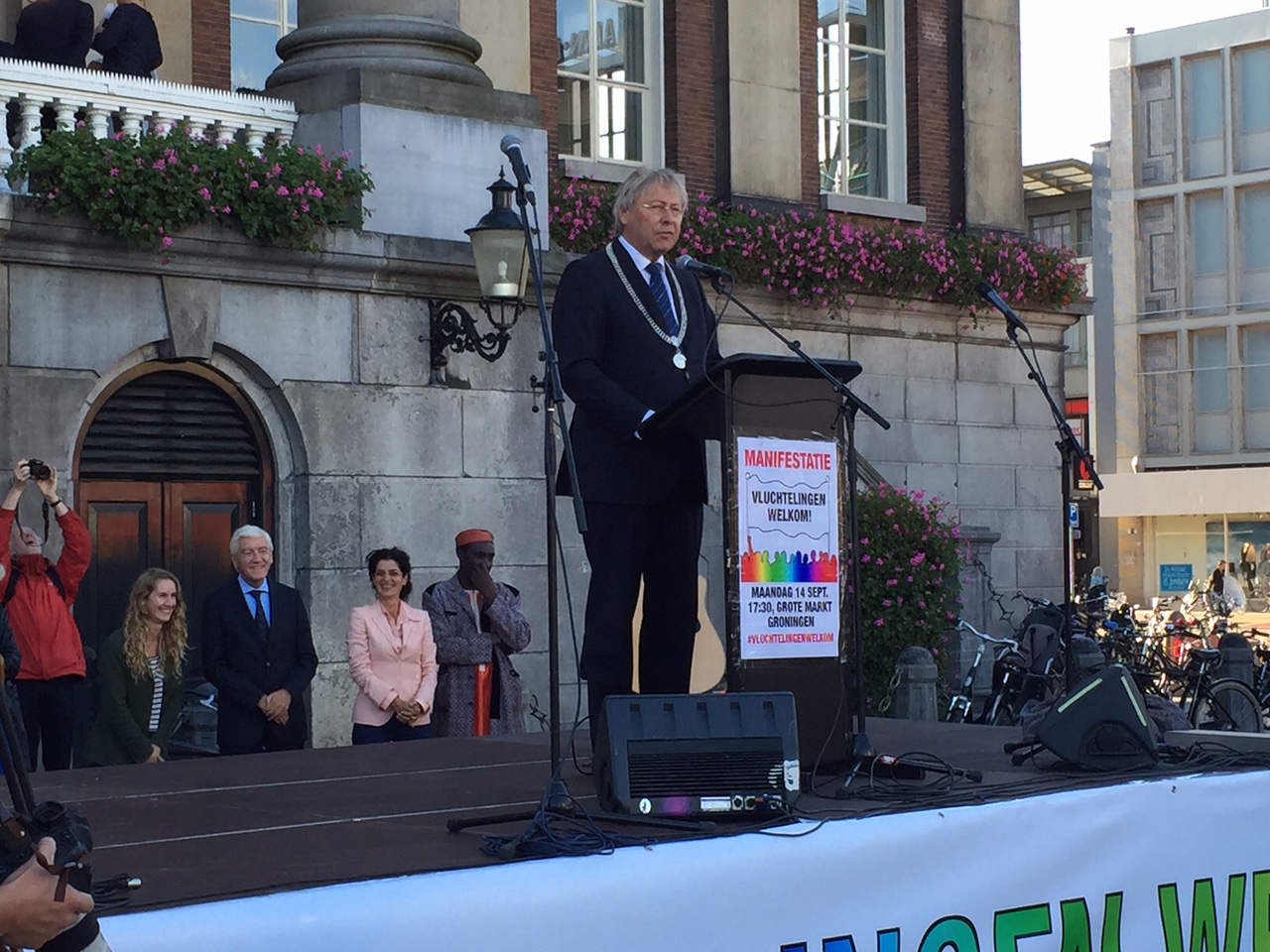 "Niemand blijft onberoerd als je de beelden in de media ziet", zei Den Oudsten. "Iedereen met een hart in z'n lijf weet dat er iets moet gebeuren. Elke vluchteling heeft z'n eigen verhaal. Ze hebben ellende moeten doorstaan en het vergt doorzettingsvermogen om een veilige plek te vinden. In eigen land hebben ze geen bestaan en dat is onrechtvaardig. Groningen neemt z'n deel en we werken aan een goede opvang. Voor op korte en op lange termijn."