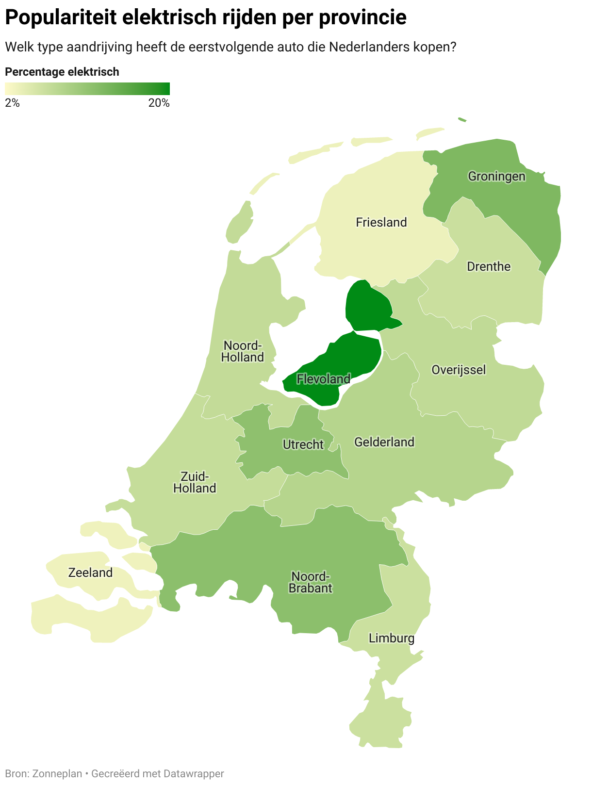 Waar elektrisch rijden in Groningen dus populair is, bleek uit eerder onderzoek van Zonneplan ook al dat de provincie het hoogst scoort als het gaat om zonnepanelen. Van alle koopwoningen met een geschikt dak wekt in Groningen bijna 34 procent eigen stroom op. Daarmee is het de provincie met de hoogste zonnepanelendichtheid van Nederland.