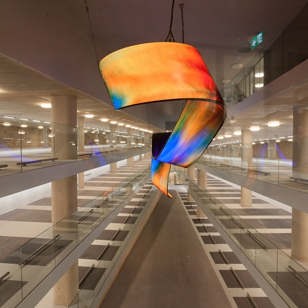 Nicky Assmann ontwikkelde specifiek voor de Forumgarage deze 20 meter lange led-sculptuur: Wervel is een verbeelding van turbulentie. Tegelijkertijd is Wervel een metafoor voor de tijd waarin we leven en de dynamiek van Forum Groningen.
